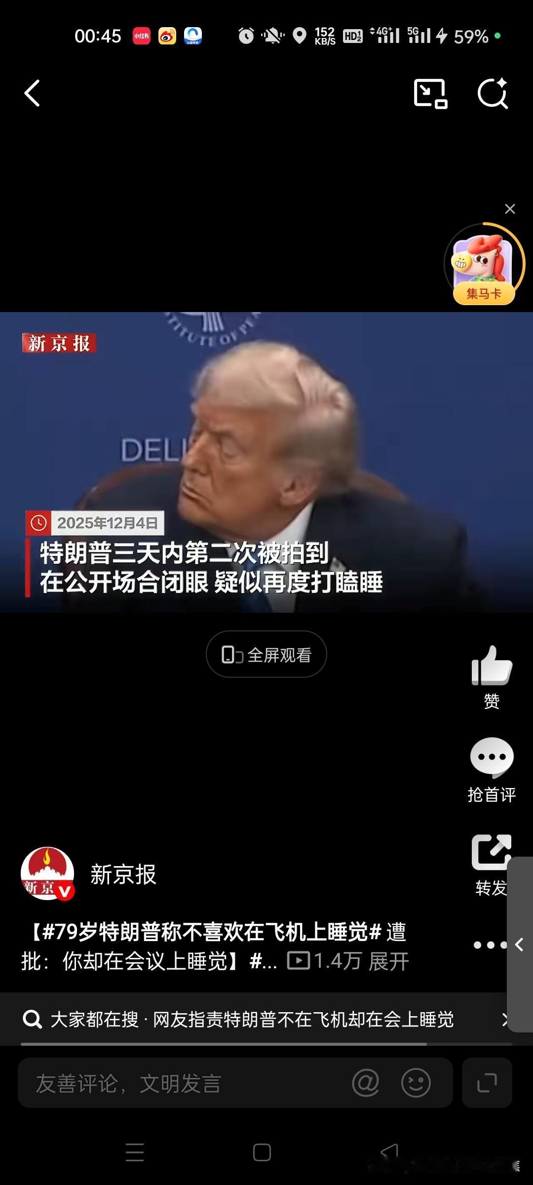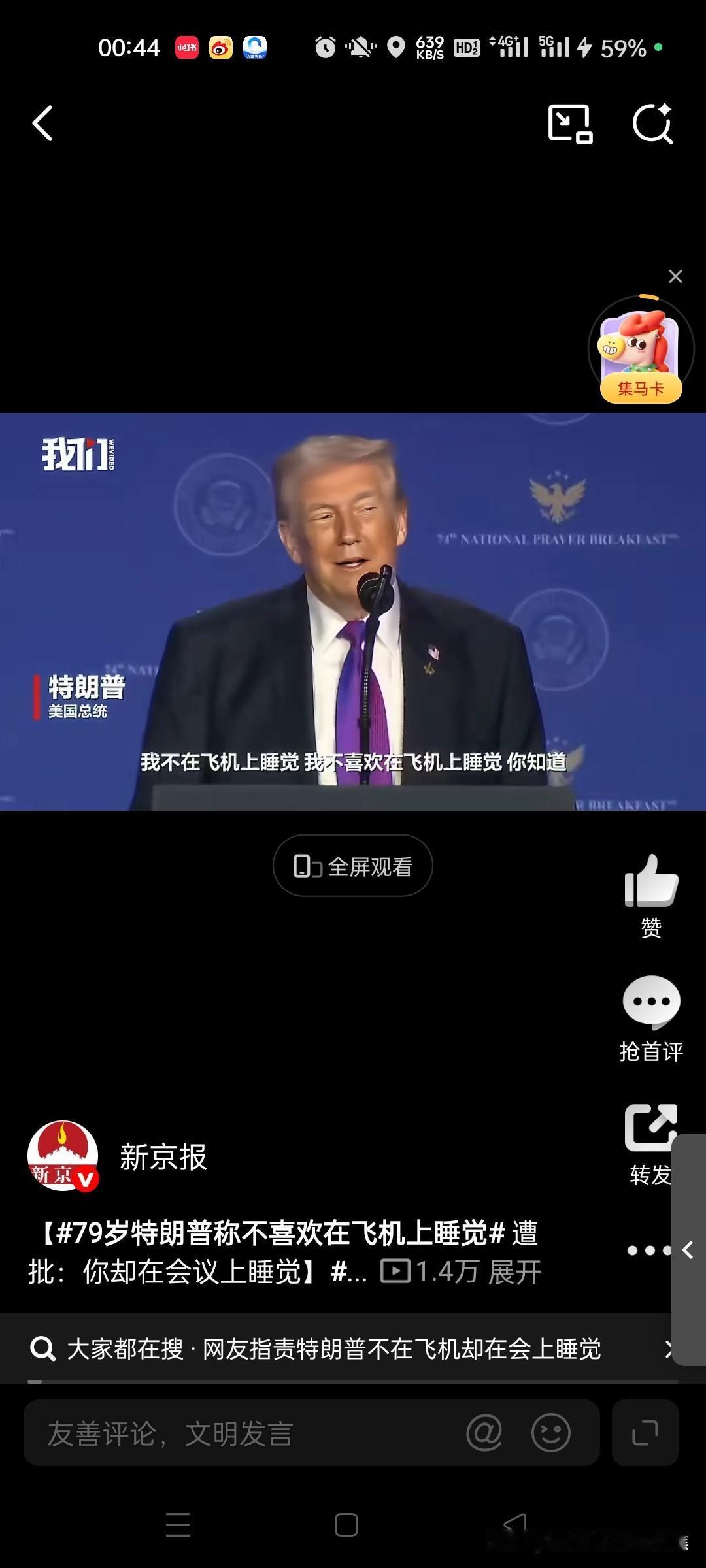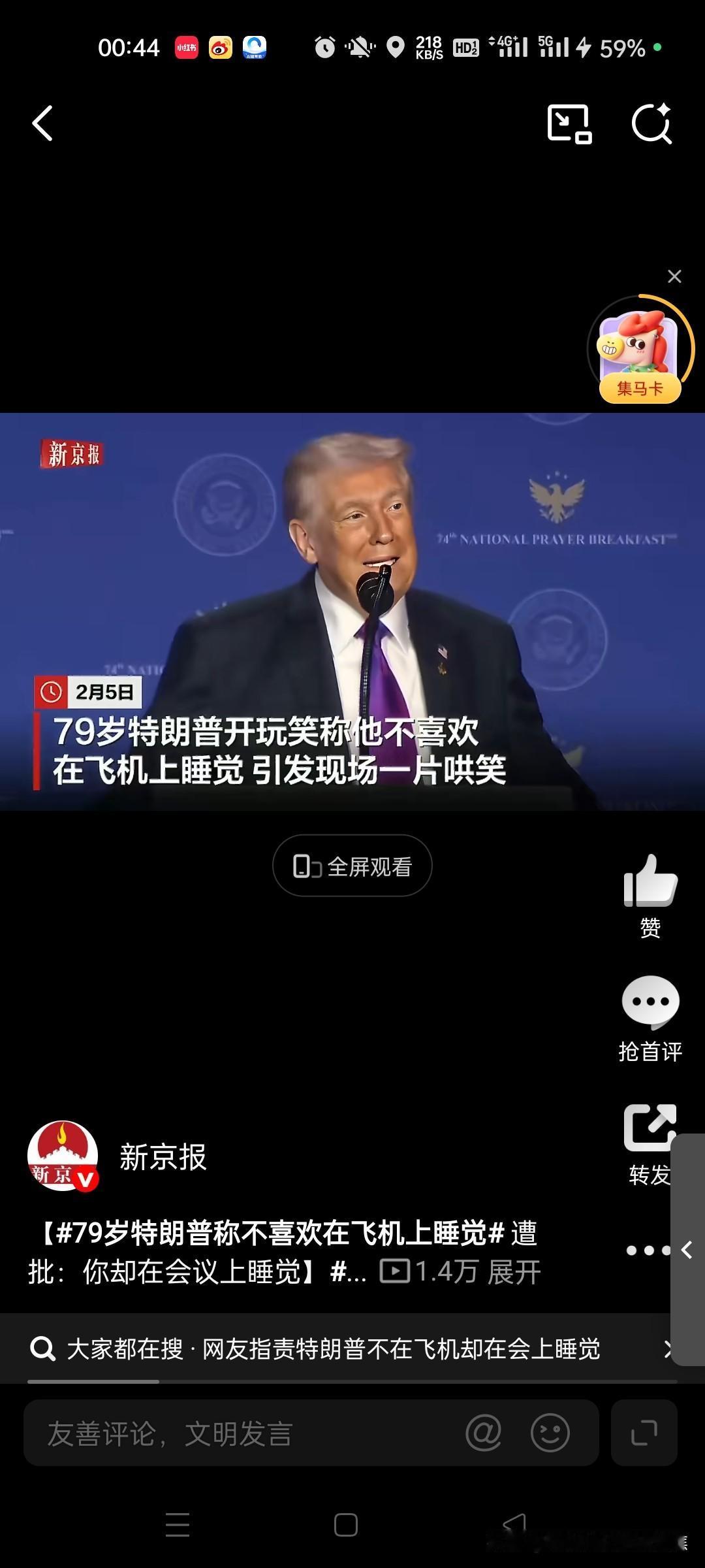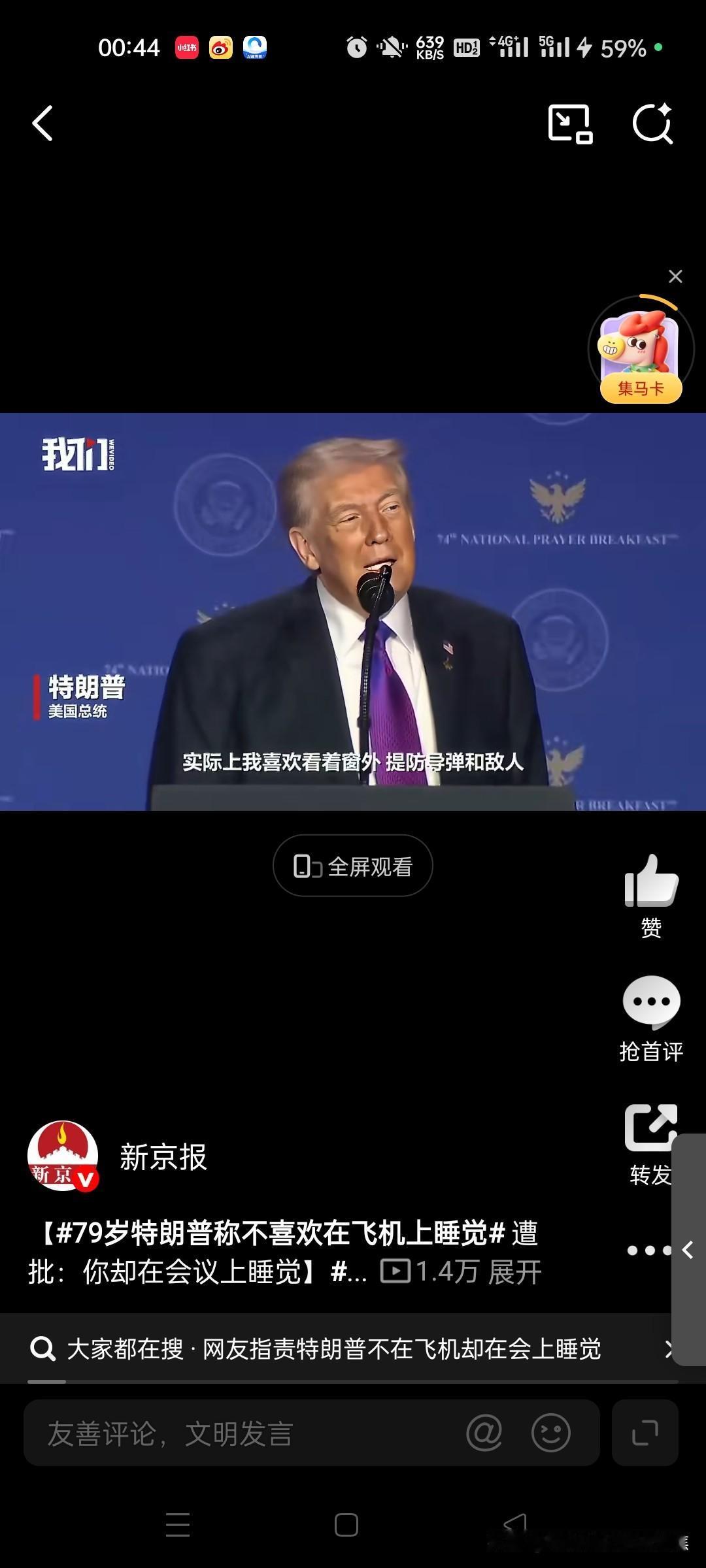 今夜,举世瞩目,都在看这老头是否会放空炮,全世界都在看他是不是笑话。特靠谱还是特不靠谱。不过,美国股市,创了新高,黄金白银上到了半山腰。 特朗普在近期演讲中自曝不喜欢在飞机上睡觉,反而喜欢盯着窗外“监视导弹和敌人”,这番混乱言论引发现场笑声,却激起网络热议,焦点集中在他睡眠习惯的矛盾和身边人的抱怨。 特朗普的核心言论与演讲现场 在2026年2月5日华盛顿特区的演讲中,特朗普用轻松语气回忆了多年前他与美军参谋长联席会议主席凯恩将军的初次会面故事。当时,他即将开启一次长达20小时的飞往伊拉克的旅程,凯恩提议他休息,但特朗普立即拒绝:“不,不,我不需要睡觉”,并反问“难道你喜欢在飞机上睡觉?”他进一步强调,自己从不睡觉,而是习惯透过飞机窗户“监视导弹和敌人”,以防备潜在威胁。这番表述因自相矛盾而引发哄笑——他先说“在飞机上睡了二十小时”,又改口“我不在飞机上睡觉”,最后归结为“不喜欢在飞机上睡觉”。@观察者网23观察者网红星新闻微天下 特朗普的睡眠习惯与助手体验 特朗普长期标榜自己精力超群,自称每晚只需“三四个小时”睡眠,这一习惯可追溯至2016年竞选时期。在长途飞行中,他几乎不眠不休,常巡视机舱检查谁在打盹,并以此为乐。为展现充沛精力,他甚至要求在飞行途中就进行军事简报。这种作风让身边助手苦不堪言:白宫消息人士透露,特朗普会强制所有人保持清醒陪他讨论事务,有人形容“和他出行像被俘虏”。美国国务卿鲁比奥更自曝会“裹在毯子里像木乃伊”藏起来,避免被特朗普发现睡觉,以免被视为“软弱”。@红星新闻5 公众批评与矛盾行为 特朗普的言论遭到网友和媒体尖锐批评,矛头直指其行为不一致。尽管他声称飞机上不睡觉,但2025年12月的内阁会议照片显示他多次闭眼,累计时长近6分钟,被质疑“难以保持清醒”。网络用户讽刺他“不在飞机上睡觉却在会议上睡觉”,新京报报道指出,这已是特朗普三天内第二次在公开场合被拍到闭眼。特朗普本人则否认精力问题,辩称会议上是“闭目倾听”。这一反差引发广泛讨论,批评者认为其自述缺乏可信度。@新京报6新京报