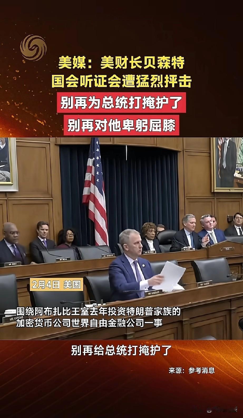 2026年2月4日在美国国会听证会上,财长贝森特遭到了猛烈的抨击,有人直接指着贝斯特说,作为财政部长,别再给总统打掩护了,别当这些人的遮羞布,别再对他卑躬屈膝,要为美国人民服务。说这话的人,言辞相当激烈,贝森特表现的倒是很冷静,一会儿戴上眼镜,一会儿摘下眼镜,显得好像没事一样!