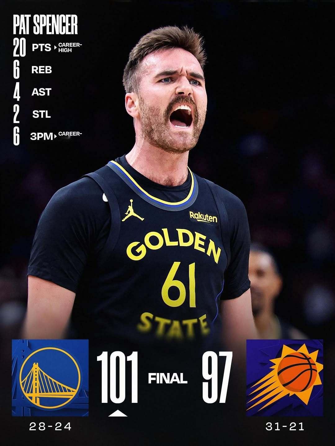 今日赛况,勇士GOAT生涯之战,隔壁张冠里戴勇士战胜太阳金州勇士NBA