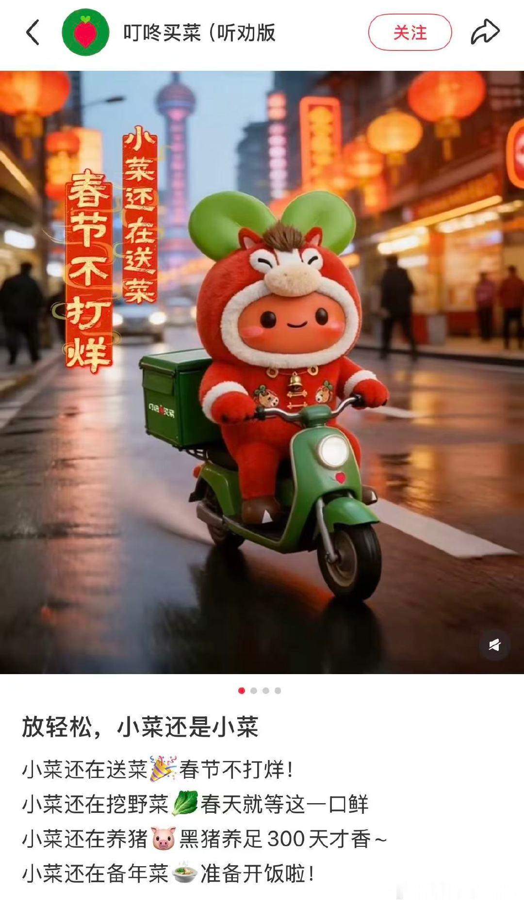 【叮咚买菜说小菜还是小菜】叮咚买菜发文 2月6日,叮咚买菜更新社媒:“放轻松,小菜还是小菜。”此前,美团公布拟7.17亿美元收购叮咚买菜引发热议。
