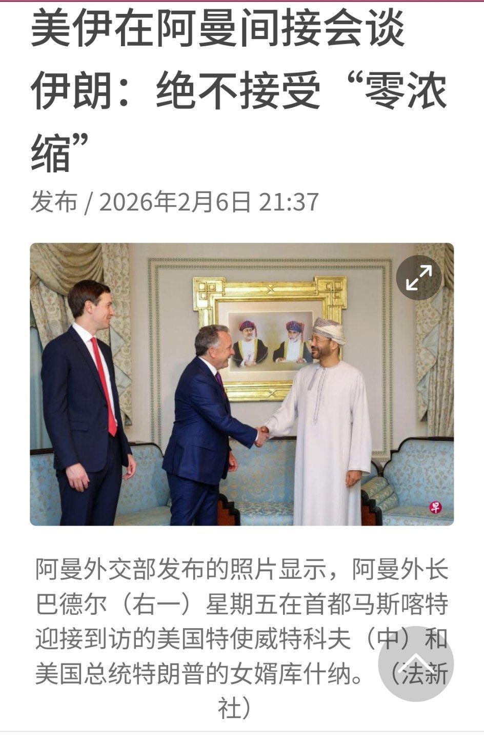 (马斯喀特综合电)美国和伊朗周五在阿曼斡旋下展开间接谈判。伊朗媒体报道,伊朗在谈判中表明,绝不接受“不得进行铀浓缩活动”这一条件。