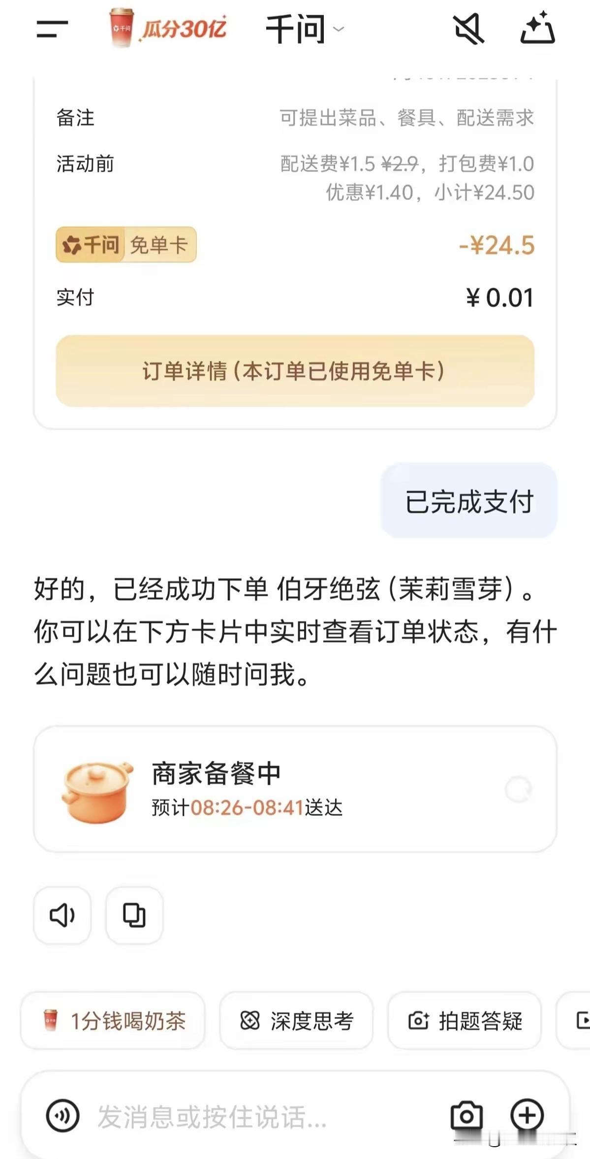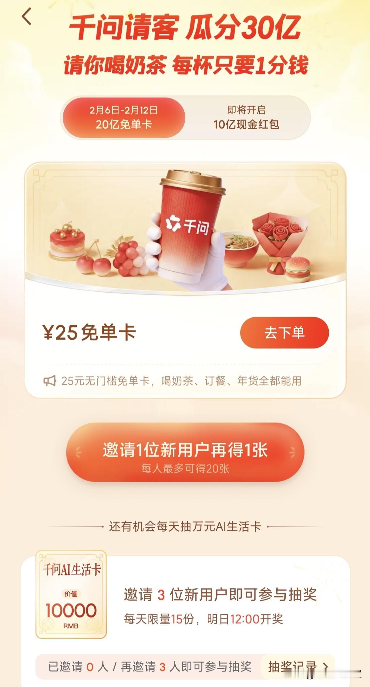 2月6日阿里千问30亿春节请客计划直接炸场!上线9小时奶茶订单破1000万单,3小时破100万、5小时冲500万,数据太疯狂。用户热情直接挤崩服务器,很多人刷不出页面、下单卡顿,满屏“活动太火爆”。官方紧急扩容兜底,这波撒钱力度拉满,成春节顶流福利,网友都薅到停不下来。 阿里巴巴千问 阿里千问 阿里押注千问