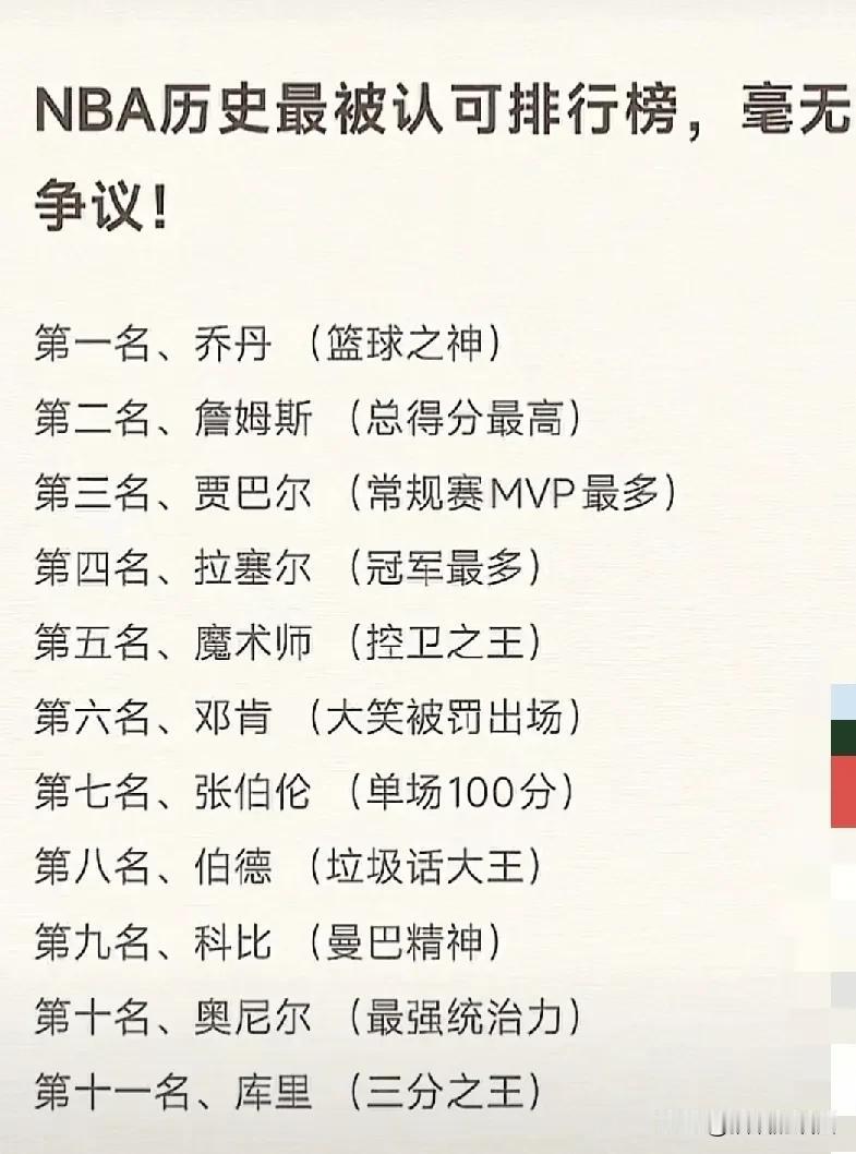 NBA历史最被认可排行榜。 基本都是事实,没有什么认可不认可,因为现实数据在那儿摆着呢,数据说话。 第六名是什么鬼?邓肯大笑被罚出场?这也最被认可?也能入榜? 邓肯因为这鬼魅一笑,技术犯规、罚款,从此不苟言笑,成为石佛!
