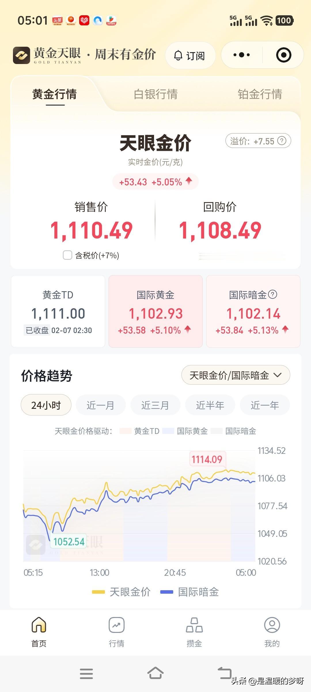 黄金又站到了1100了 一片飘红 我一直想把房子卖了。 用来买黄金。 无奈老公不同意。 老公说我是瞎折腾。 折腾来折腾去,也挣不到钱。 也没有能力挣那个钱。 还不如消停的每个月靠打工挣个3000,2000的。 老公看我直接要买。 以离婚相要挟我, 他说我要这么折腾就和我离婚。 吓得我也不敢这么操作了。