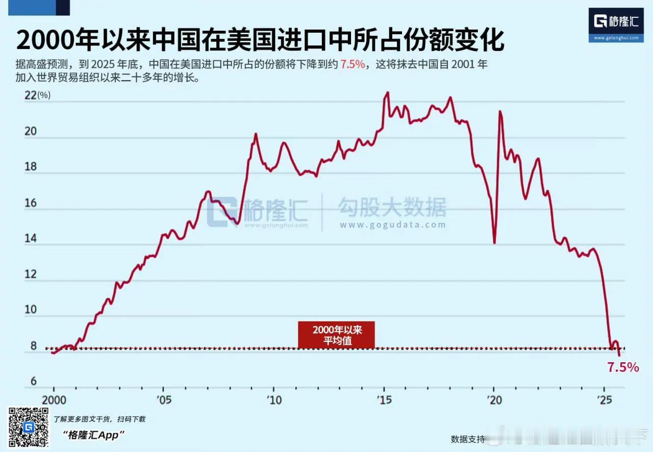 根据格隆汇这张图表,中国在美国进口中所占份额在2015年达到22%+的高点后,现已下降到约7.5%,这基本上抹去了中国自2001年加入WTO之后二十多年的增长。 但实际上,中国的出口依旧强劲,只是对美出口很大份额以转口等间接方式实现,这也是美国与各国关税谈判想堵的“漏洞”。