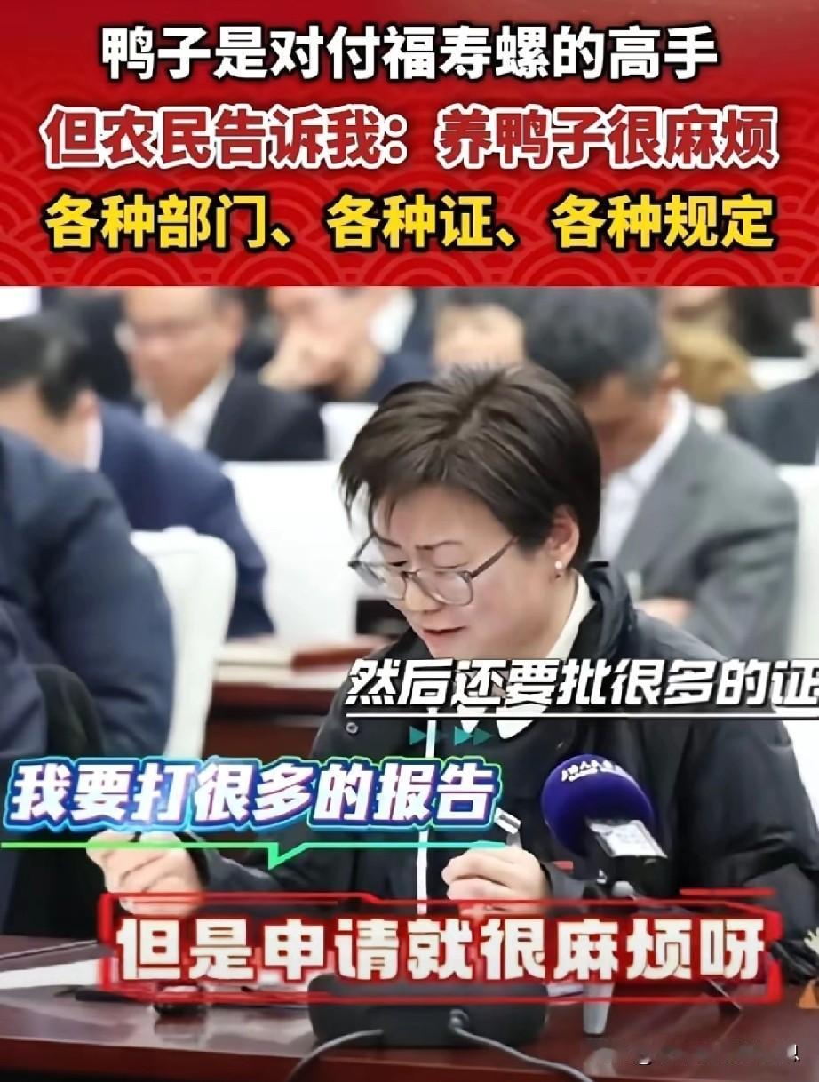 上海人大代表在两会中说“养鸭子可以防治福寿螺”,但是可行性有多大? 1.养鸭子需要多部门审批,难度不小。 2.养殖数量有限制,超过会被处罚。 3.无法保证鸭子和福寿螺的数量比例。 4.鸭子只能部分解决福寿螺。 综上所述,如果养鸭不可行,那么要根治福寿螺应该怎么办呢?