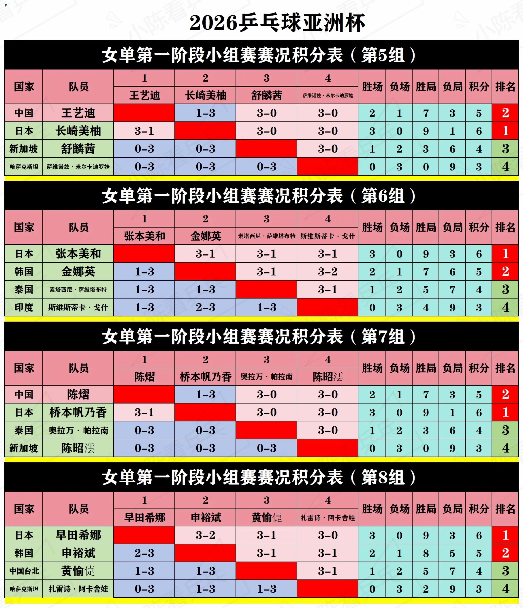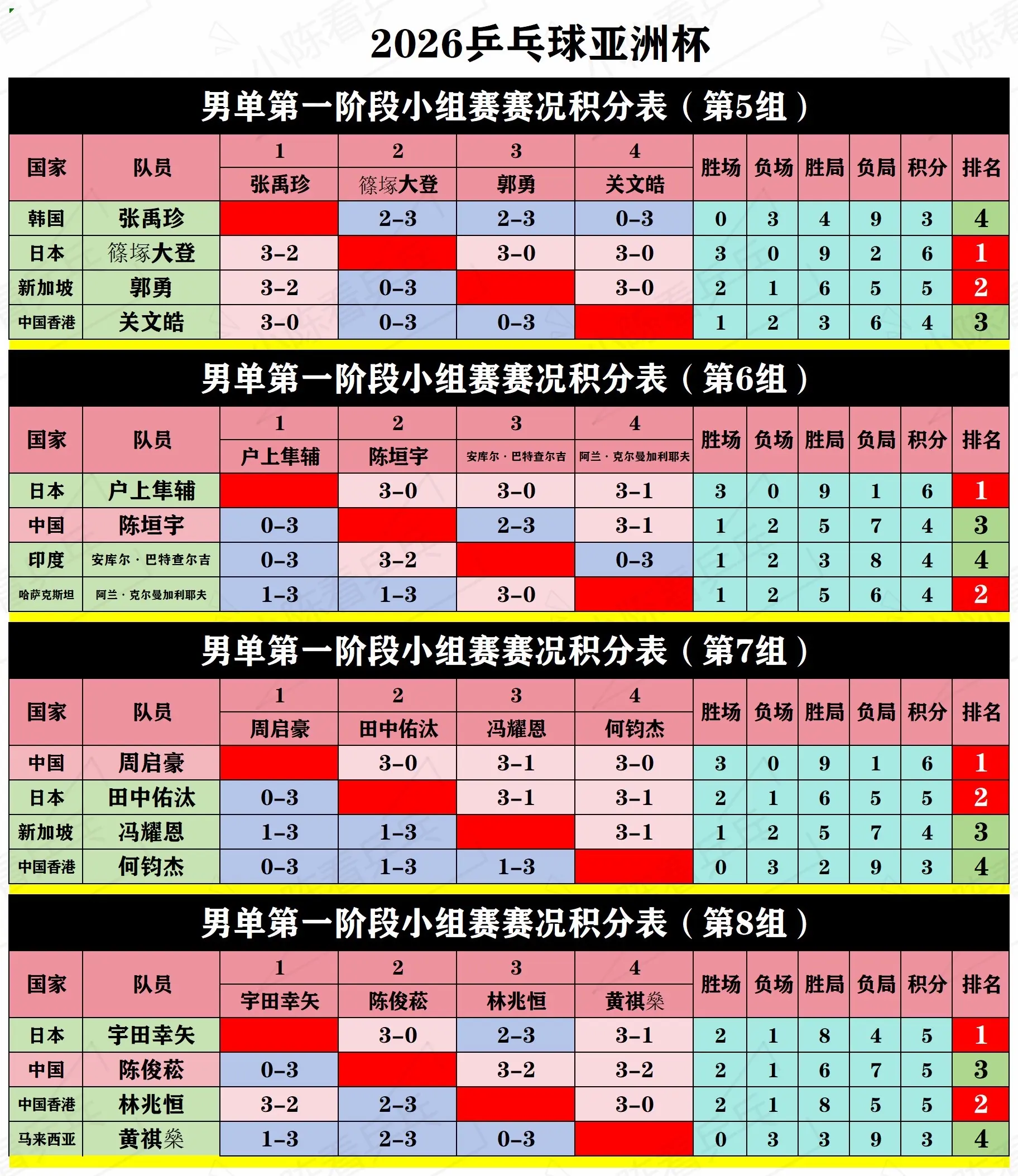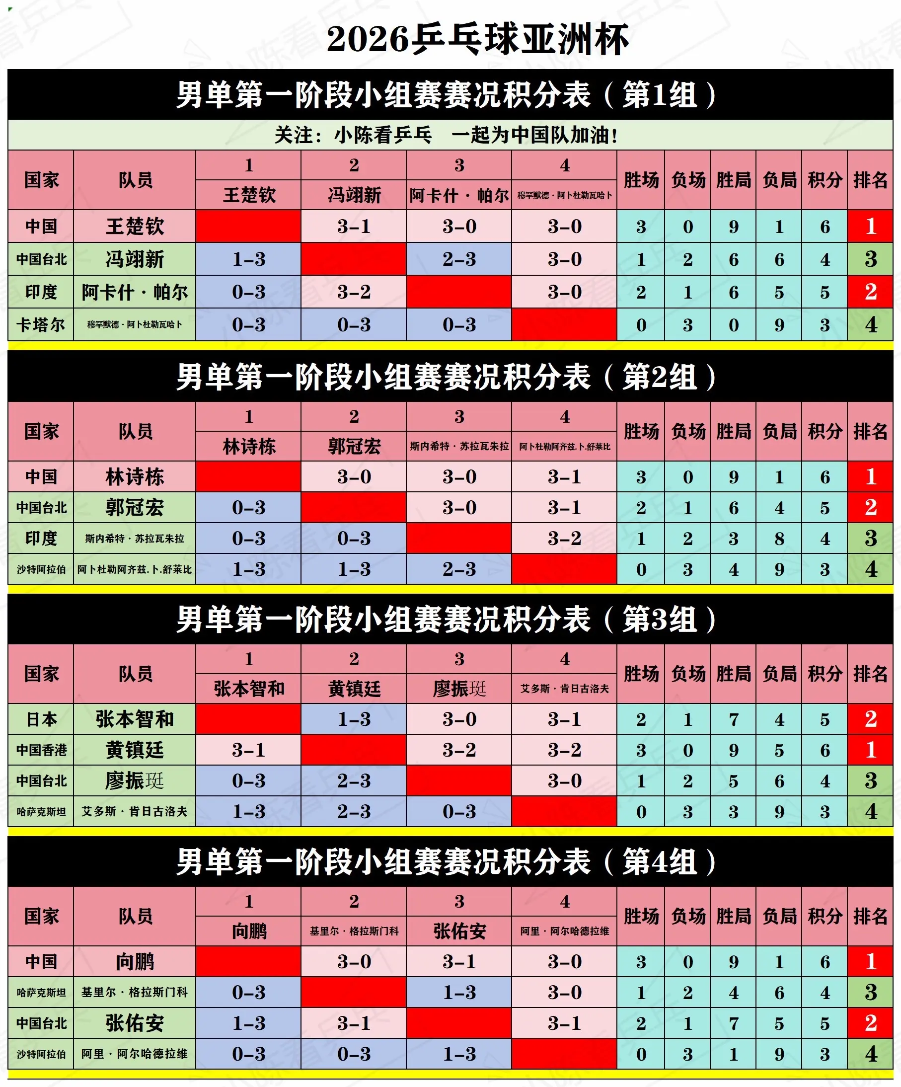 2026乒乓球亚洲杯第1阶段循环赛积分表。2026乒乓球亚洲杯第1阶段循环赛完成后积分表,小组前二晋级,男单王楚钦、阿卡什·帕尔、林诗栋、郭冠宏、黄镇廷、张本智和、向鹏、张佑安、篠塚大登、郭勇、户上隼辅、阿兰·克尔曼加利耶夫、周启豪、田中佑汰、宇田幸矢、林兆恒晋级,女单孙颖莎、叶伊恬、王曼昱、赤江夏星、陈幸同、杜凯琹、蒯曼、苏籽童、长崎美柚、王艺迪、张本美和、金娜英、桥本帆乃香、陈熠、早田希娜、申裕斌晋级,中国队继续加油。