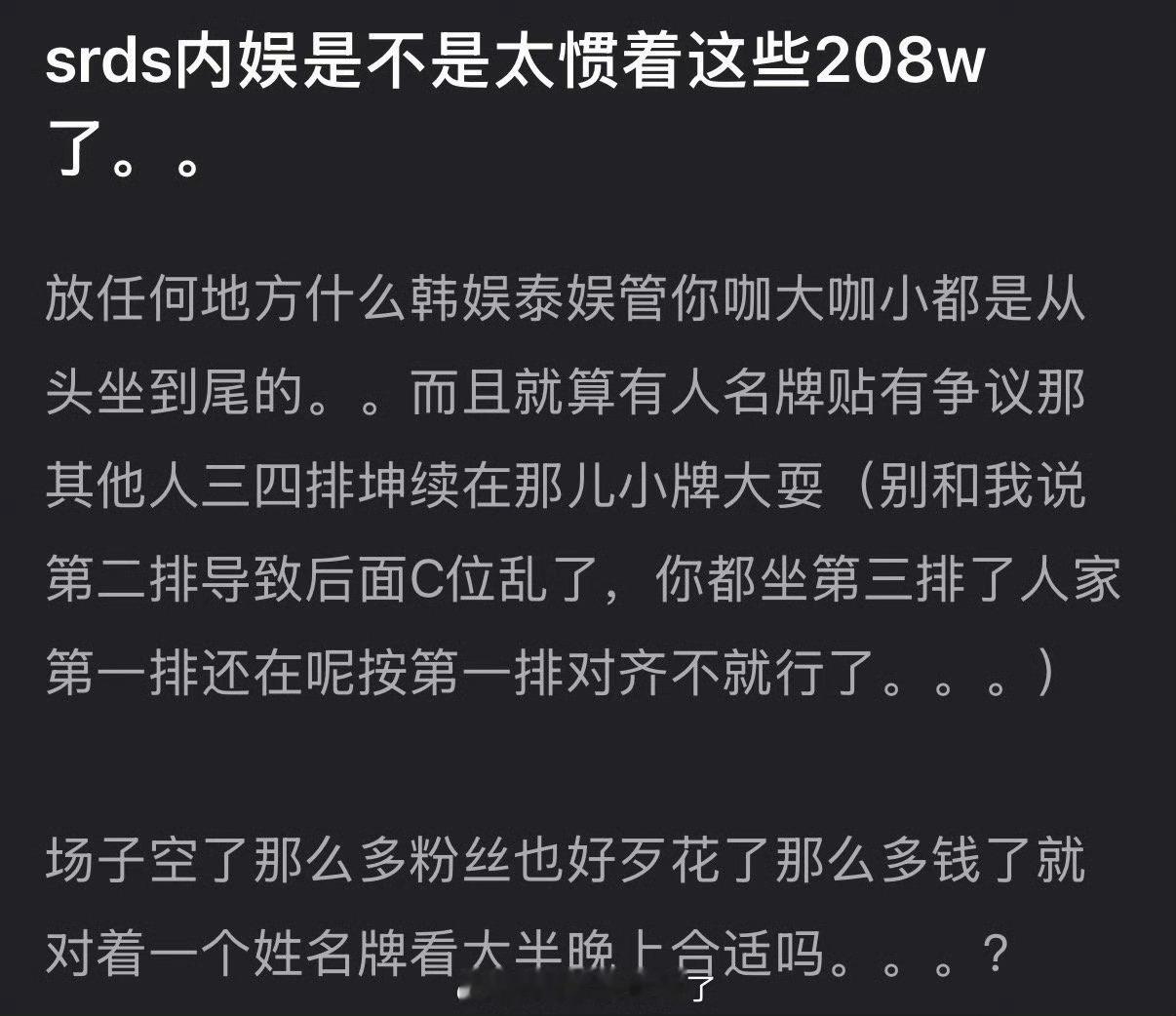 微博之夜过后有网友问内娱是不是太惯着这些208w了?放任何地方什么韩娱泰娱,管你咖大咖小都是从头坐到尾的,场子空了那么多,粉丝也好歹花了那么多钱了就对着一个姓名牌看大半晚上合适吗?