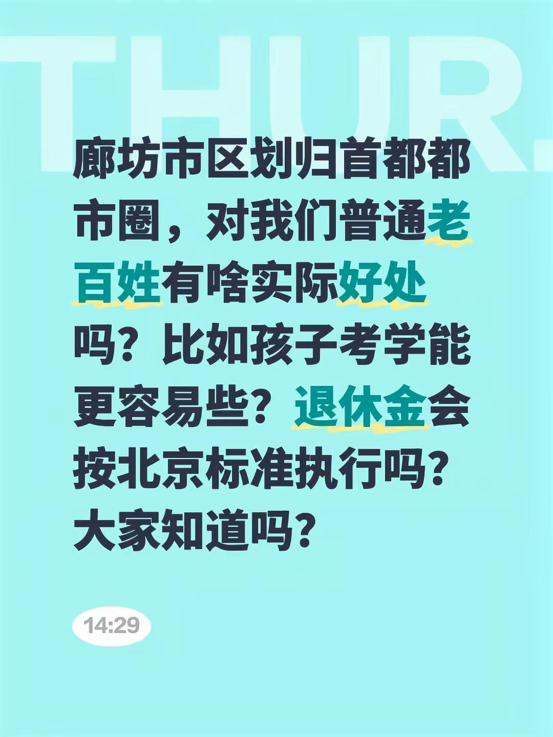 廊坊市区划归首都都市圈,对我们普通老百姓有啥实际好处吗?比如孩子考学能更容易些?退休金会按北京标准执行吗?大家知道吗?