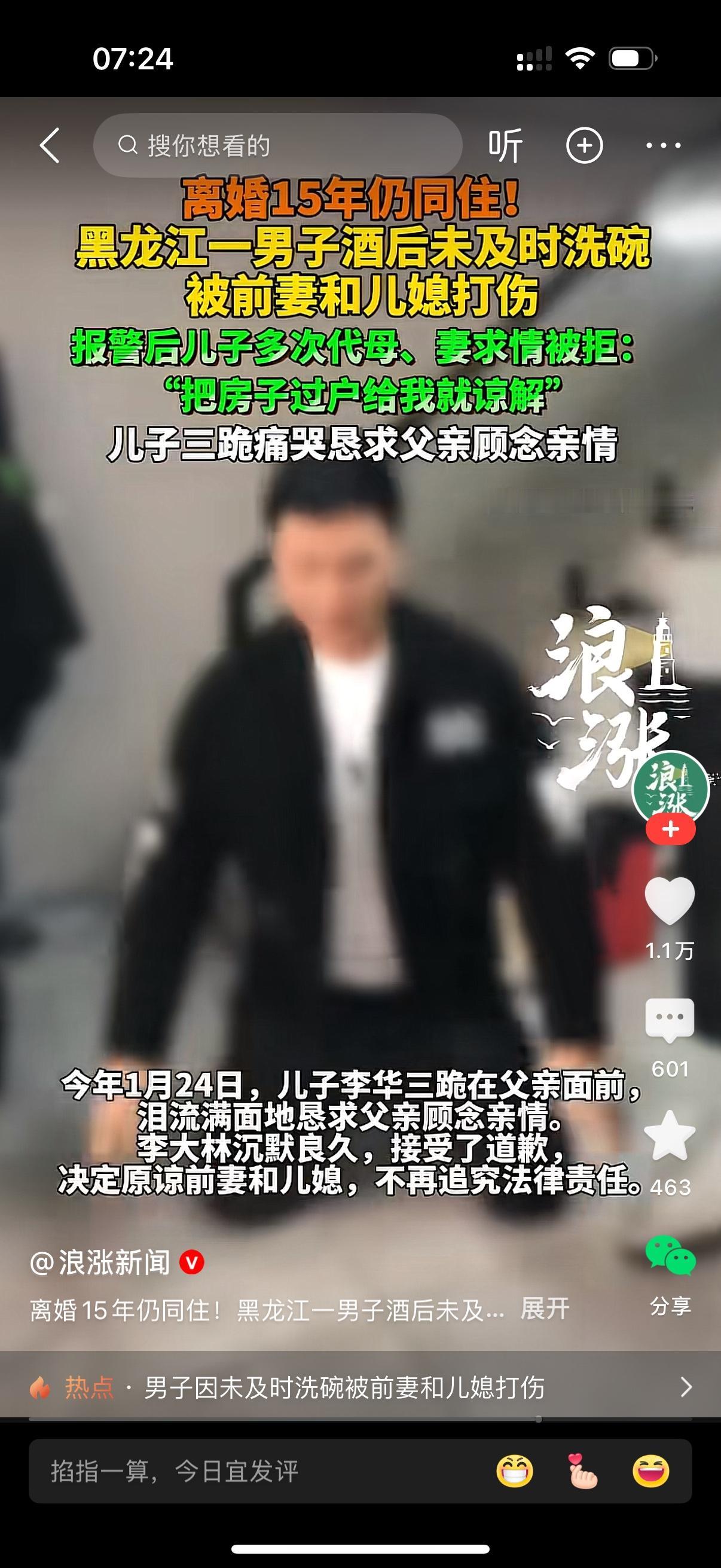 离婚15年仍同住。黑龙江一男子酒后未及时洗碗遭儿媳数落,随即与前妻发生激烈口角和撕扯,最后男子被前妻和儿媳打伤。男子报警,坚决要求追究前妻和儿媳的责任。儿子多次代母亲,妻子求情遭拒。男子说,把房子过户给我就谅解。