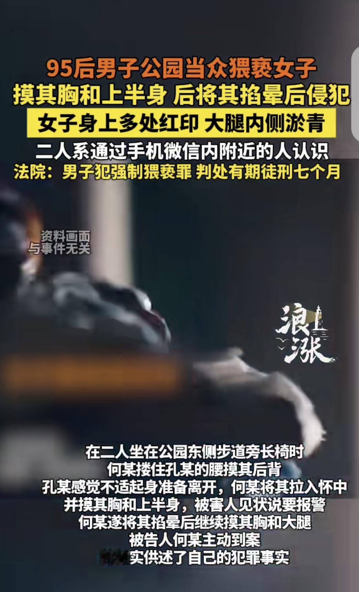 “这就是见色起意的代价!”安徽马鞍山,一31岁男子是单身,他搜“附近的人”,和一女子加为好友,两人相约去公园游玩,刚坐在长椅上,男子的咸猪手就开始摸女子后背,女子吓得起身就跑,被男子拉进怀里摸她的胸和上半身,女子奋力反抗,说要报警,男子一不做二不休,直接把女子掐晕,继续上下其手。让人不可思议的是,女子最终原谅男子,导致他本来应该判刑10个月,却只判了7个月。 何某30多了,婚姻却还没着落,看到别人出双入对,他心急如焚,对女人和家庭的渴望与日俱增,既然现实中缘分难遇,他就决定在网上碰碰运气。 于是,何某经常去搜“附近的人”,和孔女士不期而遇,两个人加了微信热聊起来。 2025年3月22日下午4点多,何某邀请孔女士去公园玩,孔女士当时正好有时间,也没设防,就欣然赴约。 何某骑着电动车,载着孔女士直奔公园,找到了一个长椅,决定坐下来聊会天。 可刚坐下,何某就心猿意马,双手就不安分起来,她先搂住孔女士的腰,然后摸她的后背试探。 没想到,孔女士反应很大,她觉察出何某不怀好意,立马起身要走。 何某一看,一把拽住孔女士,顺势把她拉进怀里,开始摸她的胸和上半身。 何某怎么可能让孔女士离开?在他看来,孔女士既然赴约,说明对他有意思。 否则跟一个男人出来,能是干嘛?谈人生谈理想吗?孔女士临阵脱逃就是装清高,或者装矜持。 孔女士一看何某有恃无恐,吓得奋力反抗,她让何某赶紧放自己离开,否则她就报警。 这句话让何某很恼火,他胆大的没边了,竟然直接把孔女士掐晕,继续上下其手。 孔女士醒来后发现,自己身上青一块紫一块,到处都是红印子,大腿内侧还都是淤青。 案例里没交代是孔女士报警了,还是何某主动投案自首,说是何某主动到案认罪的。 出事后,何某家人找到孔女士,给她进行了补偿,补偿金额没做交代,但孔女士看在钱的份上,原谅了何某。 这个原谅,直接给何某减刑3个月,因为检方建议判处何某有期徒刑10个月,而他被被害人孔女士原谅了,最终被判刑7个月。 有人觉得孔女士不值得同情,不洁身自爱,通过附近的人认识出去约会的,基本上都知道要干嘛了,自己要去的就别怪别人。 这件事里最扯的就是何某的逻辑:“你出来约会就是默认愿意”,这纯粹是给自己的色心找借口。 人家姑娘只是出来聊个天,凭什么就得接受动手动脚?孔女士反抗的时候还敢把人掐晕,这已经不是胆子大了,是根本没把法律当回事。 再说评论里说孔女士“不洁身自爱”的人,完全是受害者有罪论。通过附近的人认识就活该被骚扰?出门和人见面就是同意被侵犯?这种歪理简直害人不浅。孔女士就算有判断失误,但错误的根源是何某的恶行,不是她的出行选择。 孔女士选择原谅,可能是觉得拿了补偿能减少自己的损失,从个人角度可以理解,但确实也让何某少受了惩罚。 不过法律里的谅解本来就是给受害者的选择权,不能因为减刑就苛责孔女士。真正该骂的是何某,错了还嘴硬,以为别人的善意是放纵自己的理由。 何某在公园当众强行猥亵孔女士,已构成强制猥亵罪。他掐晕受害者的行为属于恶劣情节,原本应从重处罚,但因其主动投案并取得被害人谅解,法院依法从轻量刑。 受害者的谅解是酌定从轻情节,能体现双方矛盾化解,但不能抵消犯罪事实。 对此,你怎么看?