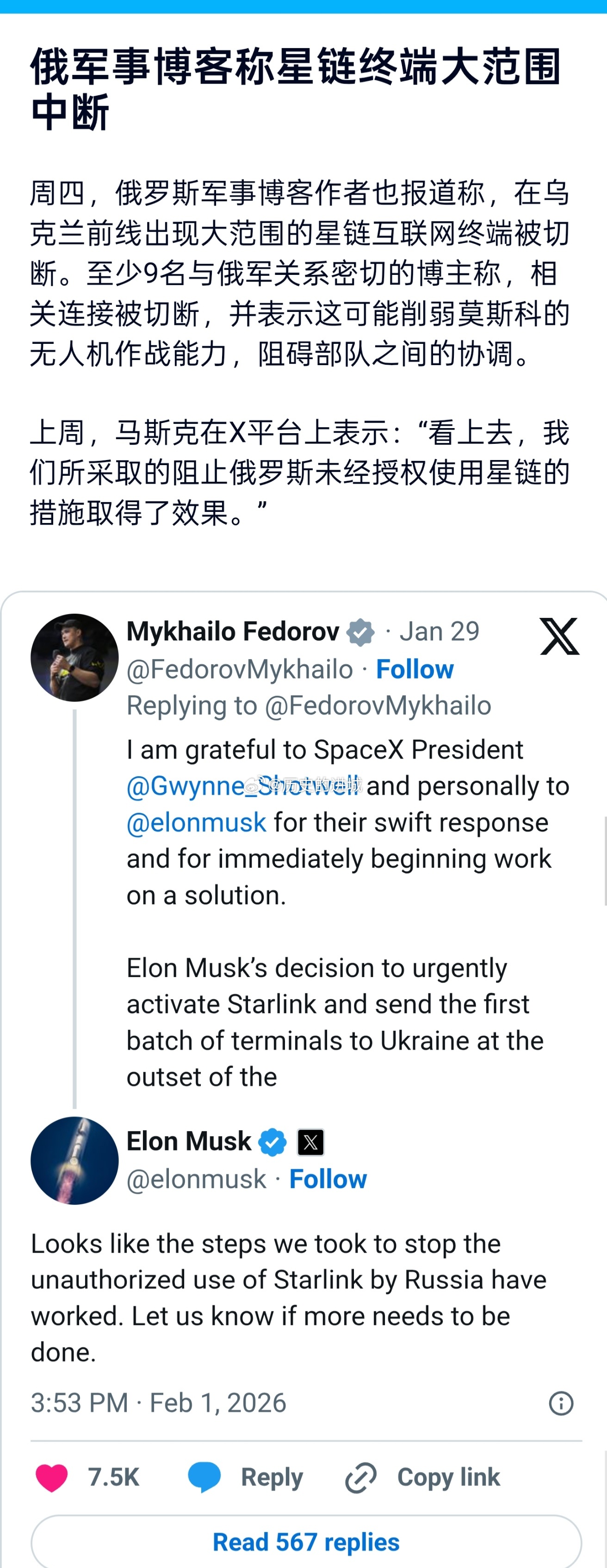 本周四(2月5日),乌克兰国防部长费多罗夫表示,俄罗斯军队在乌克兰前线使用的星链互联网终端已被停用。此前,乌克兰请求马斯克的SpaceX公司帮助,中断俄罗斯在乌克兰使用星链服务。费多罗夫的顾问别斯克列斯特诺夫表示,俄军随后失去了指挥控制以及无人机导航能力。他说,在多个地区进攻已经停止。