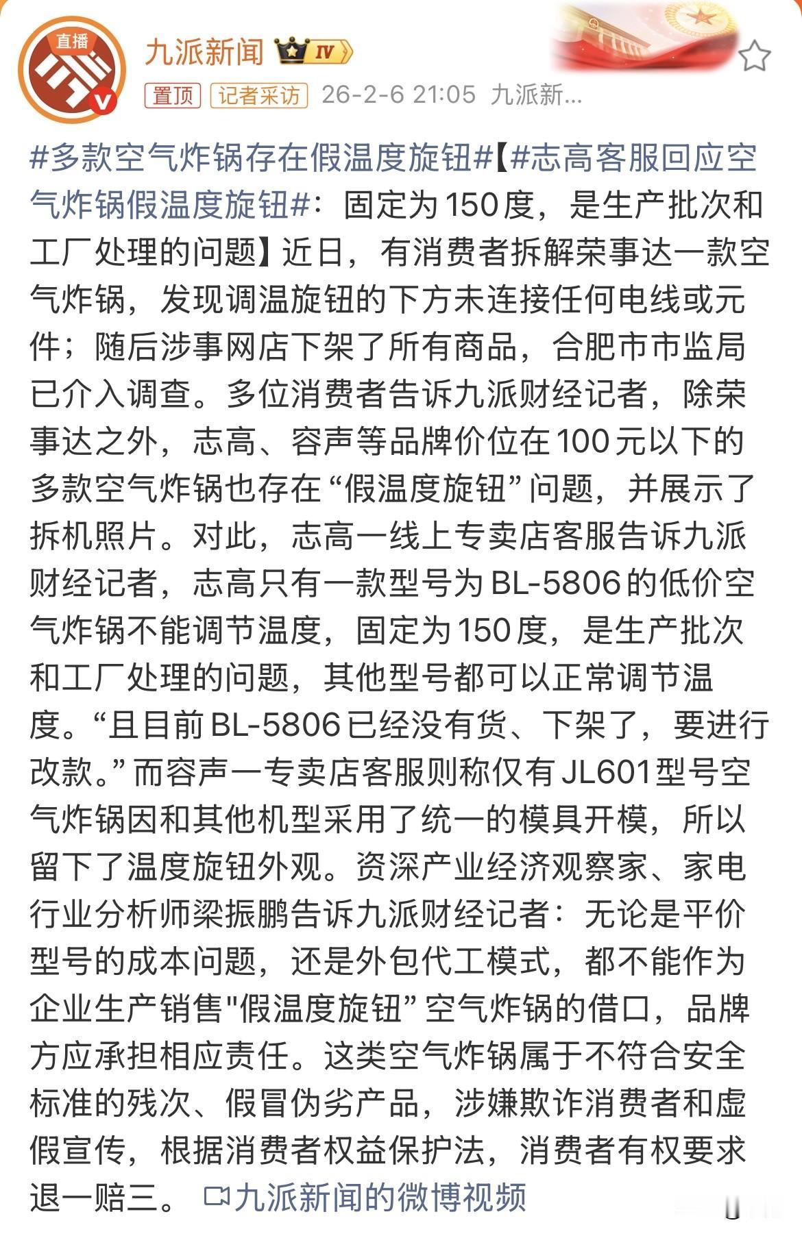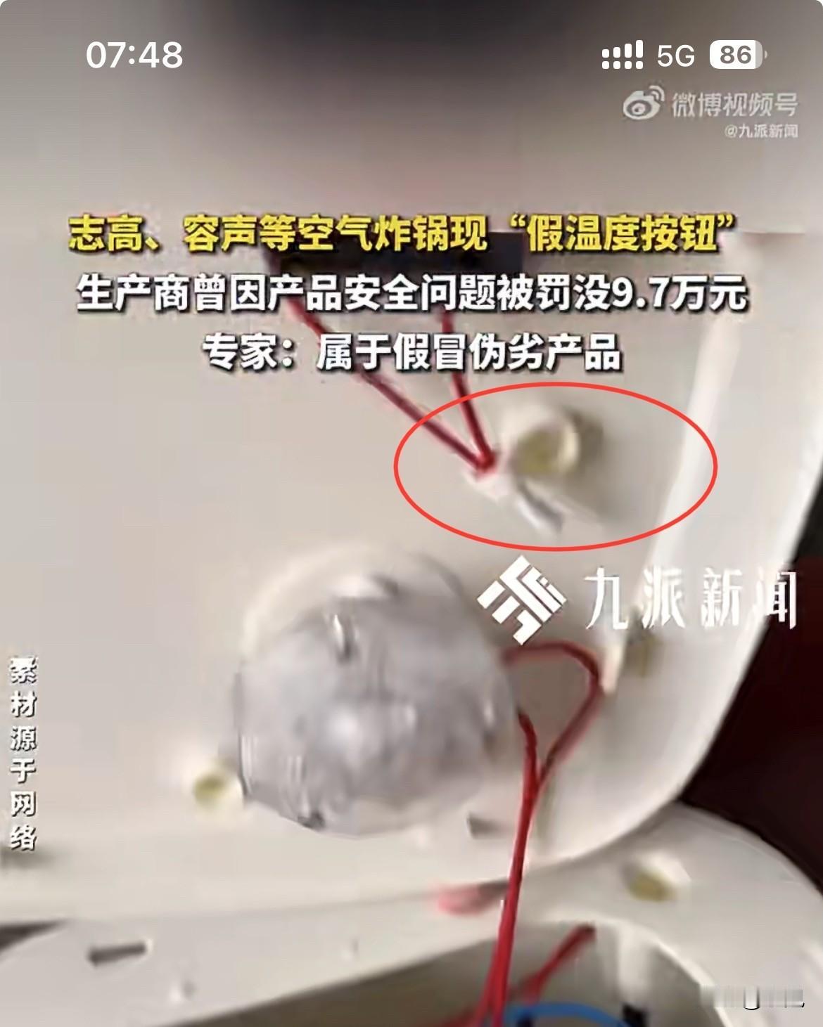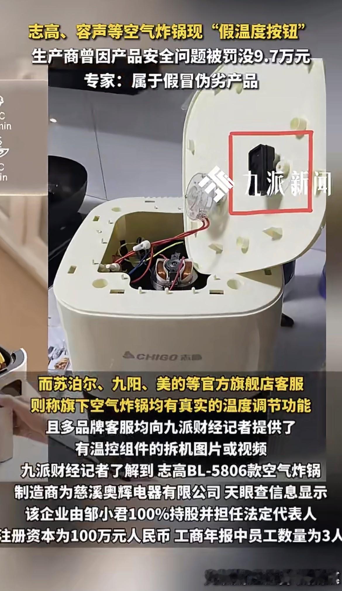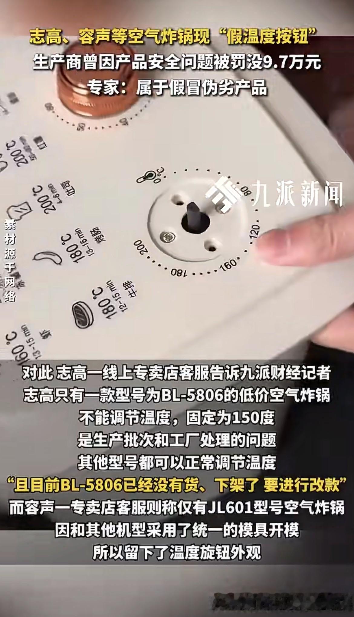 踩雷了!买空气炸锅,温度旋钮居然是假的! 荣事达那款,旋钮下面空空荡荡,一根线都没有。曝光后,店里的货全下架了,市场监管局也去了。 不光是它。有买家拆开志高、容声一百块以下的机器,也是一样的情况。旋钮能转,但里子是空的,根本调不了温度。 去找客服。志高说,就一款BL-5806不能调温,是“生产批次和工厂处理的问题”,还咬定150度固定温度“能用”。现在这款没货了,要“改款”。 容声那边更干脆,说JL601型号就是用了统一模具,旋钮就是个“外观”。 这话听着就气人。一个旋钮,转起来咔哒响,刻度从0标到200,到头来告诉你是样子货。这就像买辆车,方向盘能转,但轮子不跟着动。 更让人后怕的是,这些机器可能连基本安全都保证不了。行内人说,合格的空气炸锅必须有完整的温控回路,这是国家强制标准。没这装置,就是不合格品,有安全隐患。 而且,造志高那款机器的慈溪奥辉电器有限公司,去年11月就因为生产销售不合格的空气炸锅,被罚没将近9.7万块钱。这哪是偶然,分明是老毛病。 专家说,别管什么成本高还是代工模式,都不能是装假旋钮的借口。这就是残次品,涉嫌欺诈和虚假宣传。按消费者权益保护法,买了可以要求退一赔三。 想想挺讽刺的。很多人图便宜,买个百元机,想着炸个薯条鸡翅。结果温度锁死150度,薯条外面糊了里面生,还以为是自家手艺不行。谁能想到,是机器从一开始就骗了你。 现在店是下架了,可已经卖出去的怎么办?消费者的信任,又该怎么算? 你家里有空气炸锅吗?有没有怀疑过,你转的那个旋钮,到底有没有用? 来源:九派新闻