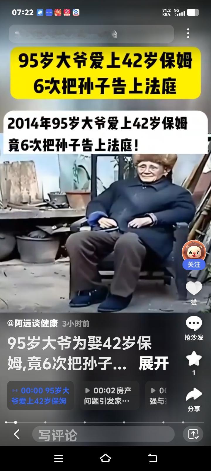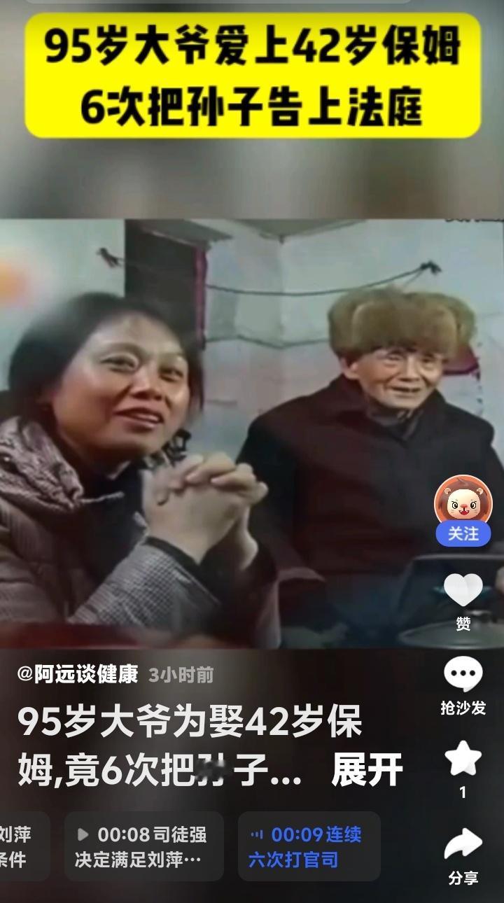 95岁上海老洋房惊现黄昏恋大战:爷爷为42岁保姆六上法庭,孙子死守房产泪洒公堂! 夕阳下的上海弄堂里,一场跨越半个世纪的亲情战争正在上演。九十五岁的司徒强老人颤巍巍地拿起法律文书,这已经是他第六次将亲孙子告上法庭。而导火索,竟是那位比他小了五十三岁的保姆刘萍。 邻居们至今记得,三年前刘萍提着行李走进石库门时的模样。她手脚利落地收拾着堆满旧物的老宅,耐心地陪着老人晒太阳、听收音机。谁曾想,这份原本纯粹的雇佣关系,会在两年后演变成一场震惊全城的婚姻登记。 当司徒强宣布要娶刘萍为妻时,整个家族炸开了锅。更让孙子司徒兴崩溃的是,爷爷竟然要求收回已过户十年的房产——那栋承载着三代人记忆的老洋房,如今要变成爷爷送给新婚妻子的礼物。 法庭卷宗显示,这场拉锯战持续了整整四百天。每次开庭,孙子都红着眼眶出示奶奶临终前的遗嘱录像,老人却攥着刘萍的手反复强调:“这是我的最后幸福。”旁听席上的亲戚们分成两派,有人骂保姆心机深沉,也有人叹老人孤独太甚。 心理学专家在采访中透露,独居老人对陪伴的渴望往往超出常人想象。当子女忙于生计,那个每天端茶送药的身影,很容易成为情感依赖的载体。而房产,则成了这段关系中最尖锐的试金石。 更令人唏嘘的是,调查发现刘萍老家还有两个正在读大学的子女。她在接受调解时哭诉:“我只是想要个保障,有错吗?”这句话像针一样扎进司徒兴心里——他想起奶奶省吃俭用供自己读书的往事,如今祖产却要落入外人手中。 第六次庭审那天,老人破天荒地没有让保姆陪同。他对着法官慢慢鞠躬:“我这把年纪了,就想有个人陪着走完最后的路。”话音未落,旁听席突然传来孙子的哽咽:“爷爷,我每天加班到半夜,不就是为了早点换大房子接您一起住吗?” 这场官司最终以调解告终,老洋房保住了,刘萍拿着二十万补偿款离开了上海。但弄堂里的茶余饭后,人们还在争论:这究竟是黄昏恋的勇气,还是精心设计的骗局?或许在孤独面前,每个人都可能成为情感的俘虏。 黄昏恋争议 房产保卫战 代际冲突 (来源:深广电第一现场及根据2014年上海静安区法院多起关联案件改编,人物为化名)