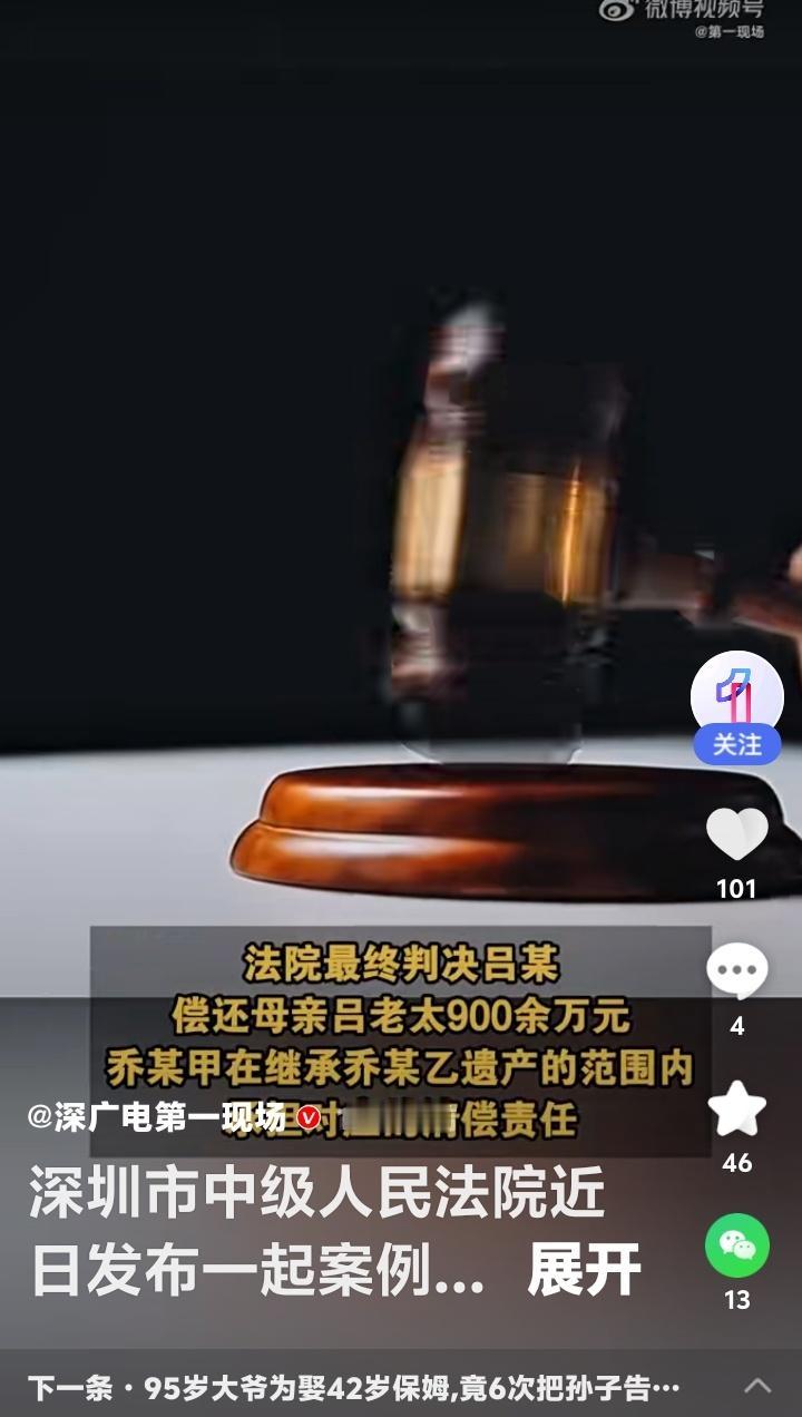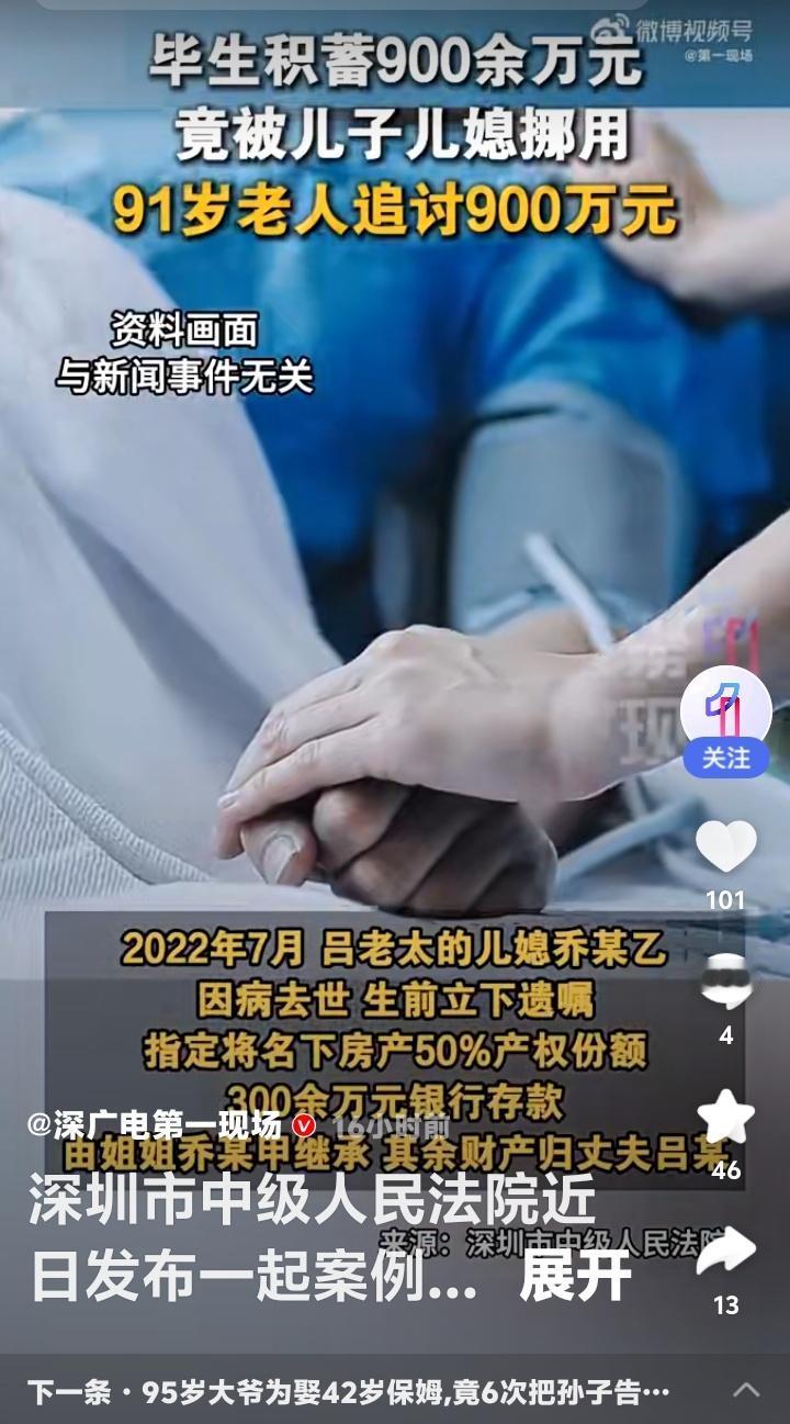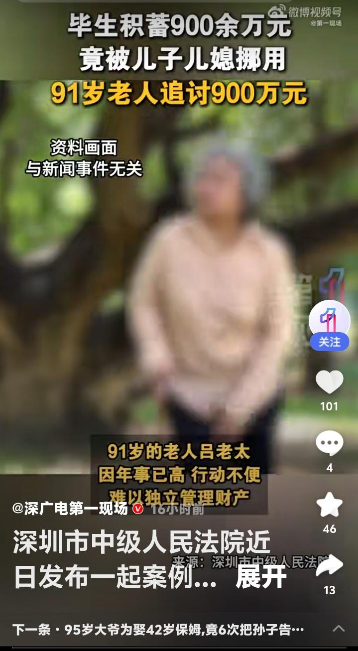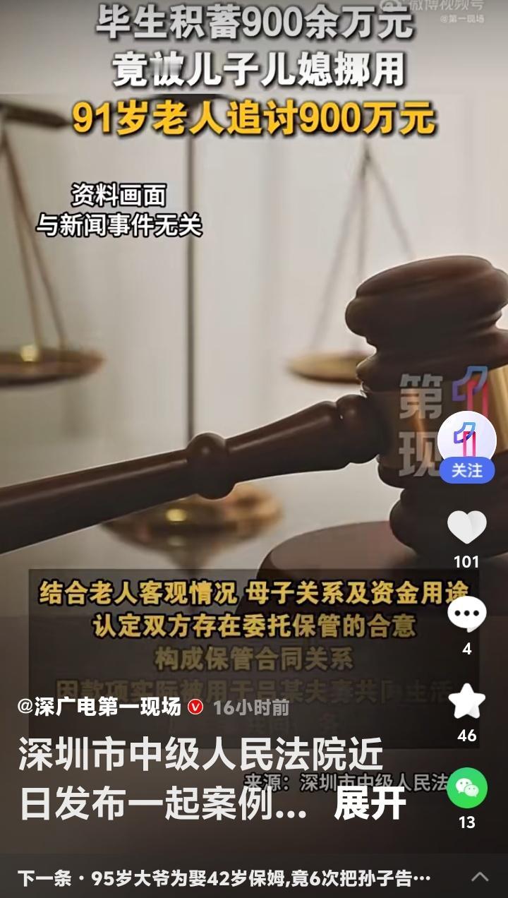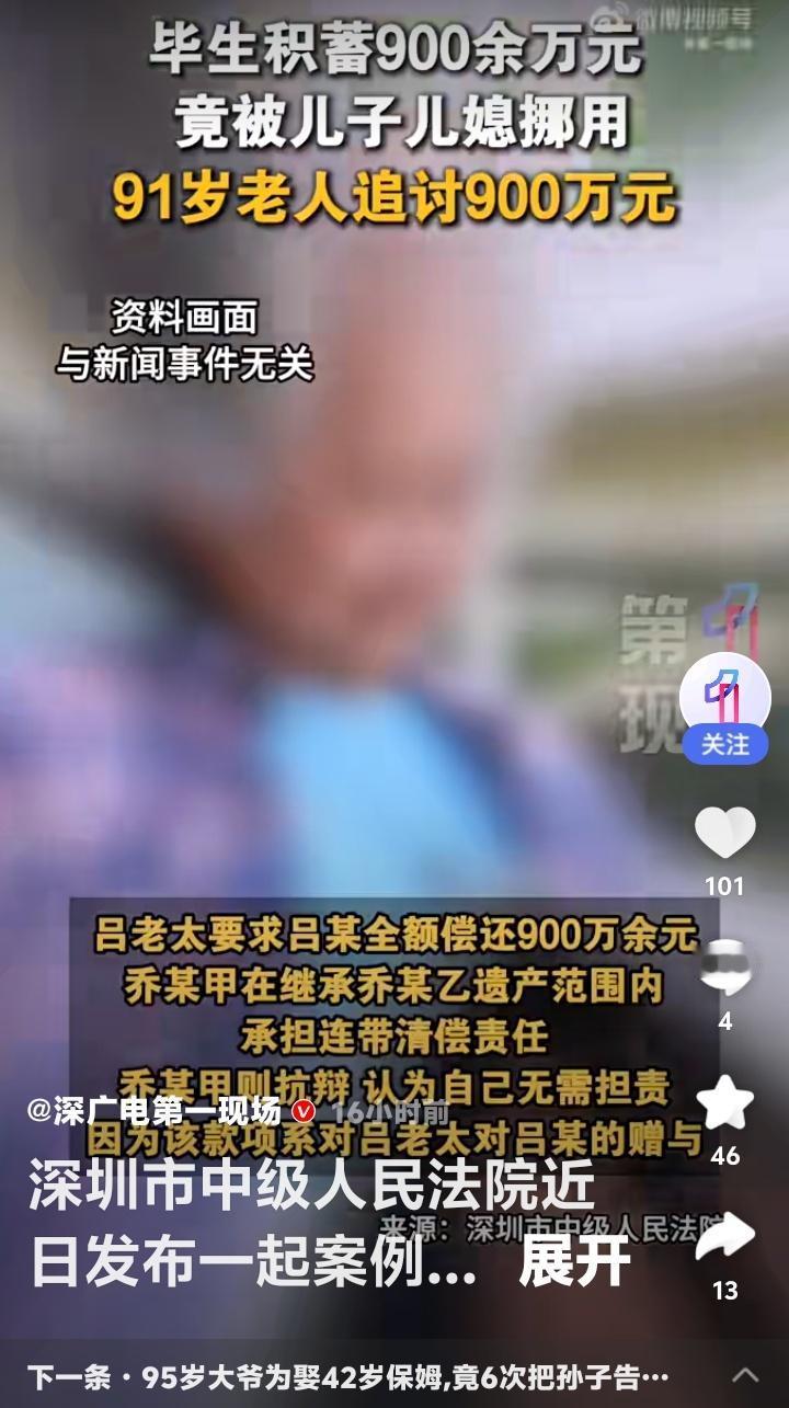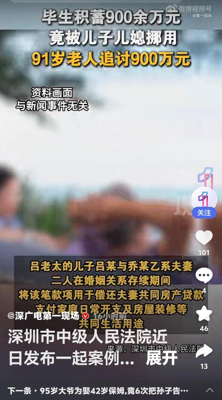 深圳九旬老母卖房款900万毕生积蓄托付独子竟被儿媳挪用装修还贷,法院一纸判决揭亲情背后残酷算计 当九十一岁的皱纹里刻满信任,换来的却是银行账户上冰冷的数字游戏。深圳吕老太怎么也想不到,自己亲手递出的养老钱,竟在儿子儿媳的账户里上演了一出“乾坤大挪移”。这笔含着北京卖房款的毕生积蓄,从2018年开始分批转入儿子名下时,或许还带着母亲手心的温度。 可亲情的外衣下,往往藏着最现实的算计。儿子吕某与妻子乔某乙拿到钱后,毫不犹豫地投入了夫妻共同房产的贷款、装修和日常开销。在他们眼中,这或许只是“家庭资金池”的合理调配,但在法律面前,这却是一道清晰的界限——保管与占有的界限。 更令人心寒的转折发生在2022年。儿媳乔某乙病逝前立下遗嘱,将名下房产份额和三百余万存款指定由姐姐乔某甲继承。这一举动,仿佛在家庭账本上划下一道分割线,也让九百多万的归属彻底成谜。老人发现真相时,钱已散尽,只剩一纸诉状能追索。 法庭之上,儿子一方辩称这是“赠与”,是母亲心甘情愿的给予。但福田法院的法官们看穿了表象。没有借据,不代表没有托付;没有利息,不意味没有约定。基于老人年迈无力理财的客观事实,结合资金转入后的实际用途,法院最终认定——这是一场白纸黑字的保管合同。 判决书落下重锤:儿子吕某必须全额偿还九百余万,而继承了遗产的乔某甲,也需在遗产范围内承担连带责任。这不是一场简单的经济纠纷,而是一面照妖镜,照出了亲情在利益面前的脆弱模样。 我们常说“养儿防老”,可当法律武器成为老人最后的盾牌时,这句话听起来何其讽刺。吕老太的遭遇不是孤例,它撕开了无数中国家庭“谈钱伤感情”的遮羞布。父母的爱常是无条件的信任,但这份信任,不该成为子女肆意挥霍的通行证。 金钱或许能衡量数字,却衡量不了一颗衰老的心在深夜里的叹息。当父母掏出全部,我们回报的,不该是一本糊涂账。深圳法院的这次判决,不仅追回了一笔钱,更守护了天下父母那份沉重而珍贵的托付。 (来源:深圳市中级人民法院案例通报、深广电第一现场报道) 家庭信托危机 养老钱守护