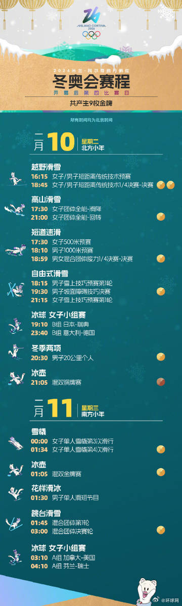 #米兰冬奥会共产生116金#【转发!收藏!#米兰冬奥追赛日历#】#米兰冬奥会开幕# 、谷爱凌、、、、、、、、、、等126名中国冰雪健儿开启逐梦之旅!从2月7日到2月22日,冰壶、滑雪、速滑、冰球、花滑等精彩赛事将轮番上演,116枚金牌将陆续诞生。详细赛程戳↓↓一起为冰雪健儿加油!(来源:央视新闻)