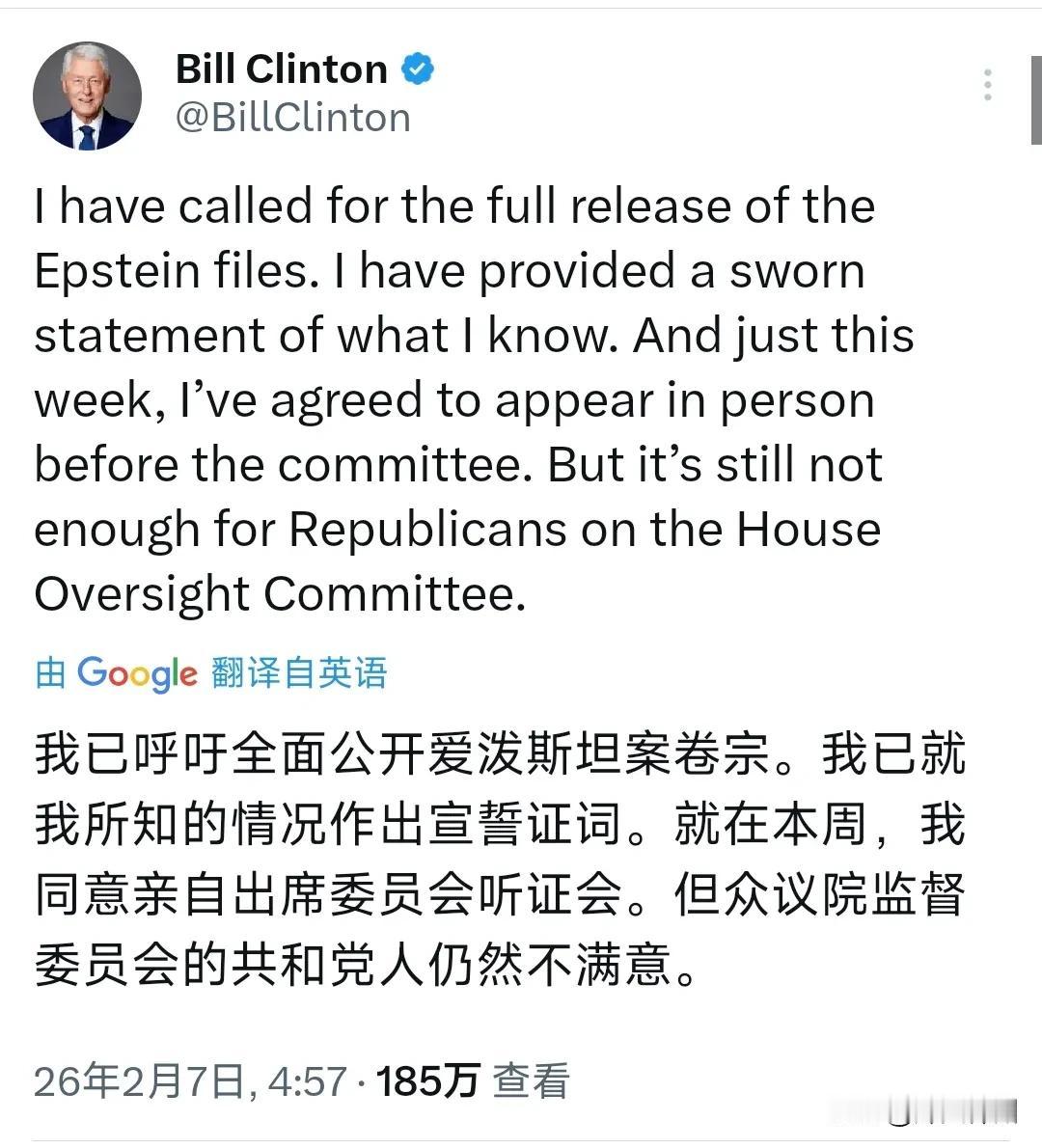 美国前总统比尔·克林顿今天(北京时间2月7日)发文写道:“我已呼吁全面公开爱泼斯坦案卷宗。我已就我所知的情况作出宣誓证词。就在本周,我同意亲自出席委员会听证会。但众议院监督委员会的共和党人仍然不满意。现在,科默主席(共和党众议院监督委员会主席)说他想要摄像机,但只能在闭门会议期间拍摄。这种安排对谁有利?不是爱泼斯坦的受害者,他们理应得到正义。也不是公众,他们理应知道真相。这仅仅服务于党派利益。这不是事实调查,而是纯粹的政治活动。我不会坐视共和党人把我当成道具,在闭门进行的非法审判中耍弄我。如果他们想要答案,那就停止这些把戏,用正确的方式解决:举行公开听证会,让美国人民亲眼看看事情的真相。” 评几句: 78岁比尔·克林顿再度卷入华盛顿政治漩涡!面对爱泼斯坦案调查,他直言“不会坐视共和党人把我当成道具”,昔日历经莱温斯基案弹劾风暴的老将,正式与共和党正面交锋,爱泼斯坦案也成了双方正面交锋的核心战场。 克林顿的操作堪称教科书级的危机公关:主动要求全面公开相关文件、已作宣誓证词、同意亲自出席听证会,这三连招精准反击,瞬间将皮球踢回共和党阵营。而科默主席“闭门录像”的回应,在克林顿口中也成了“服务于党派利益”的遮羞布。 这场博弈的精妙之处在于:谁能说了算“什么是透明”,谁就占据了道德高地。克林顿深谙此道,他巧妙地将受害者正义与公众知情权捆绑,把自己塑造成追求真相的斗士,而非被调查的对象。当他说“让美国人民亲眼看看事情的真相”时,实际上是在邀请全国观众共同见证这场政治审判。 然而,华盛顿的潜规则从来不在聚光灯下。科默坚持闭门听证的理由冠冕堂皇——保护敏感信息、维护程序正义,但克林顿团队显然嗅到了选择性泄露的风险。毕竟,在这个信息容易被歪曲的时代,一段被剪辑的录像,足以对其三十年的政治遗产造成巨大冲击。 更具讽刺意味的是,这场以“追求正义”为名的调查,双方都在计算政治筹码。共和党需要在大选年前点燃保守派基本盘的怒火,民主党则需要将丑闻转化为“政治迫害”的叙事。而爱泼斯坦的受害者,不过是这场权力游戏中被反复提及的注脚。 当克林顿拒绝成为“闭门非法审判”的道具时,他真正捍卫的或许不是真相,而是最后的体面——在这个人人自危的名利场,连忏悔都需要观众席。