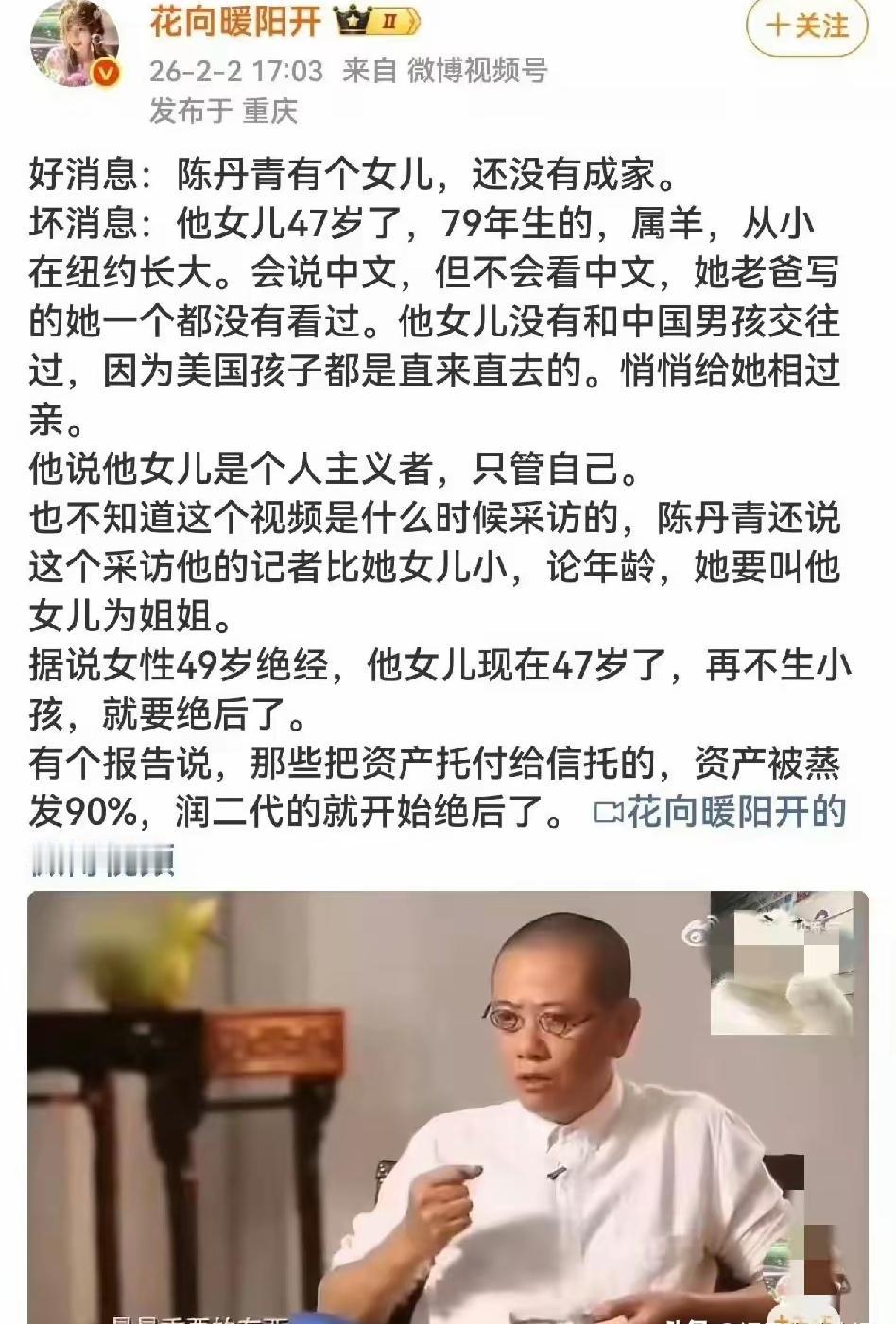 这个网友说的,如果是真的话,我终于找到陈丹青每天都很愤怒的根源了, 一幅画卖了1亿6,唯一的孩子却不肯结婚生子,万贯家私连继承人都没有,最后归了美国政府,这就是大画家的身后事, 但让人匪夷所思的是,他天天骂的,是让他挣了1亿6的国家,而天天夸的,是剥夺他财产的国家, 他是怎么做到如此奇葩的?