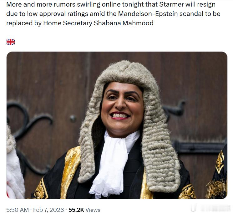 网络上关于斯塔默可能辞职的传闻越来越多,原因是他在曼德尔森—爱泼斯坦丑闻中的支持率低下,辞职后可能由内政大臣沙巴娜·马哈茂德接任。