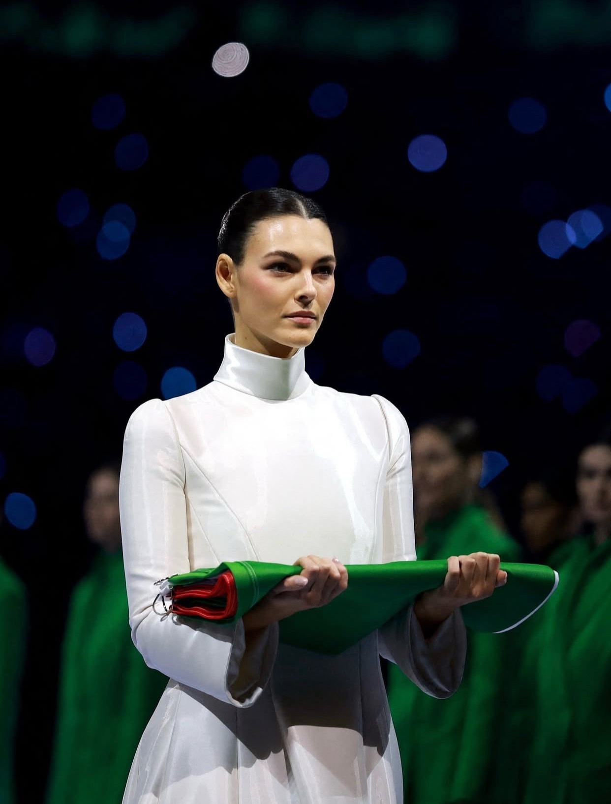 在 2026 年米兰—科尔蒂纳冬季奥运会开幕式上,意大利超模 Vittoria Ceretti 身着一袭 Giorgio Armani Privé 量身定制的白色礼服亮相。