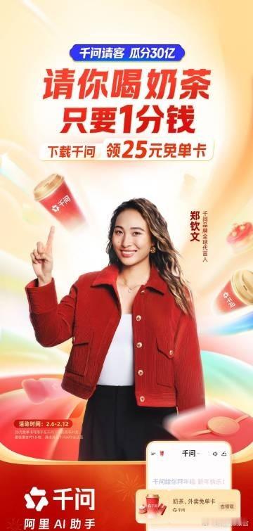 郑钦文喊你上千问AI一句话下单郑钦文邀大家用上千问APP,依托AI实现一句话下单的便捷购物体验,解锁高效、省心的消费新方式。千问免单不止奶茶千问9小时破1000万