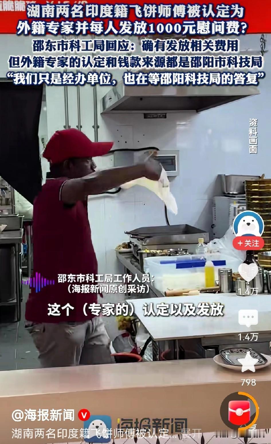两个印度男子在湖南卖飞饼,被认定为外籍专家,并发放了1000元的慰问金。 按理说能之所以能评定外籍专家,肯定是在科技,创造,发明等方面有一定的突破,有特殊的且国内紧缺的专长。 至于印度的飞饼,真的是算我愚钝,真没发现符合哪一条,哪一个规定,要说硬往上靠,也只能是国内紧缺的专长。 但飞饼和烙饼,春饼,油饼,千层饼,葱花饼,酱香饼等相比特色在哪里,还真看不出来,只能请鉴定专家来解释了!