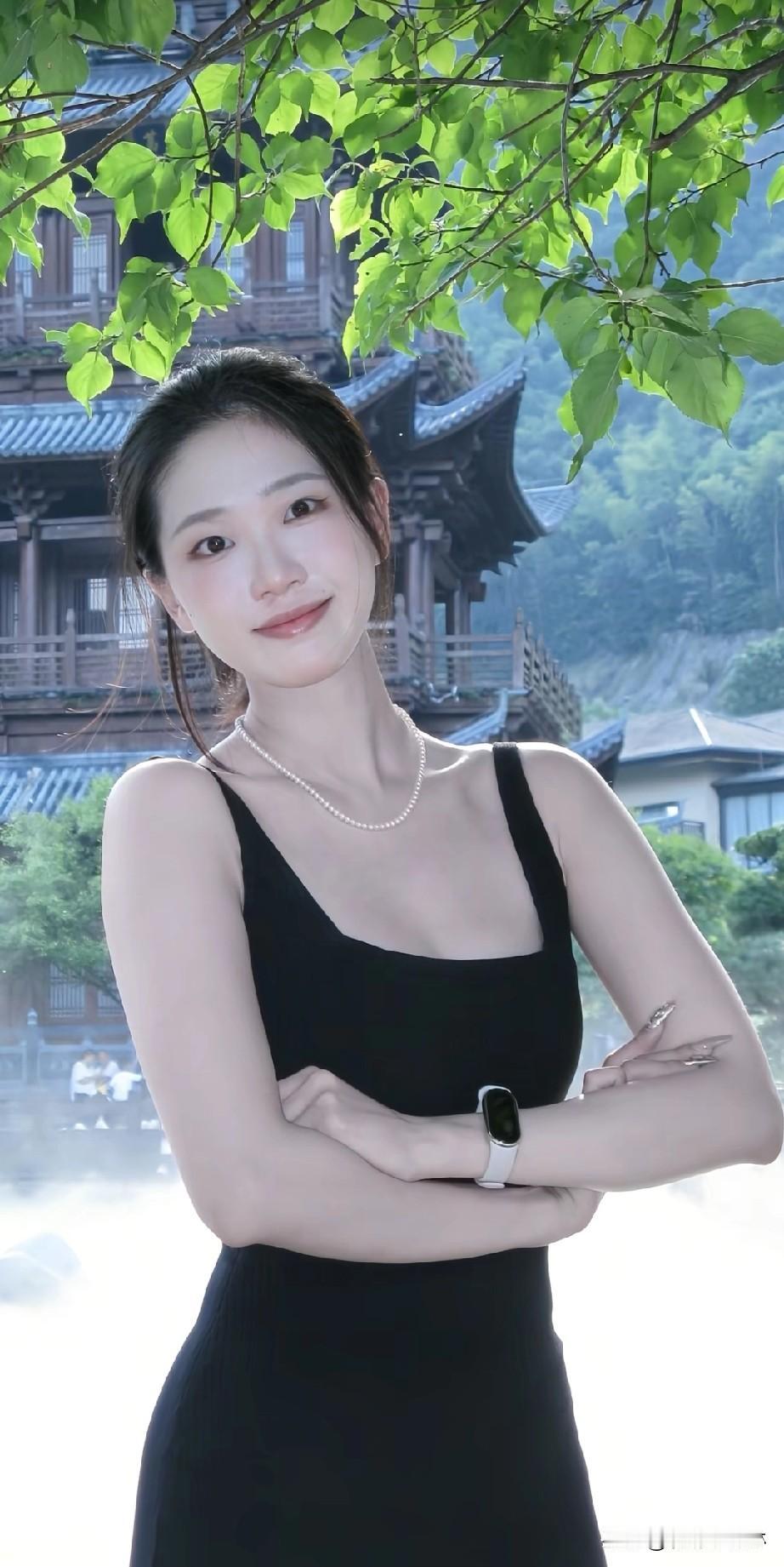 黑裙少女在湖畔,绿意盎然中尽显优雅。