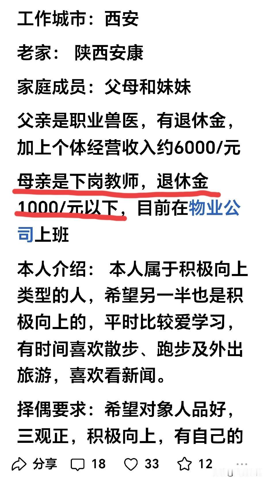 刚在头条看到一篇征婚启事,在介绍他的家庭情况时说,“母亲是下岗教师,退休金1000元以下”。 我还是第一次听说有下岗教师在个职业。如果以前是民办学校聘用制教师,那就是个打工族。如果是正式有编制的教师,怎么可能下岗?即就是犯错误了,没有开除,不能教学生了,也不可能下岗,叫你吃闲饭,不上班,白拿工资。也不可能有1000元以下的退休金。 大家说说,有没有下岗教师这个职业?教师退休金有没有1000元以下的?