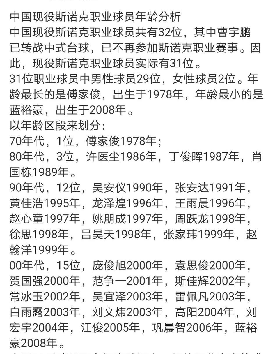 不得不佩服咱们,打着打着就将斯诺克打成了乒乓球羽毛球!这次包揽世界大奖赛四强的中国球员年龄都不算大。 肖国栋:1989年出生 张安达:1991年出生 赵心童:1997年出生 周跃龙:1998年出生 中国现役斯诺克职业球员共有32位,其中曹宇鹏已转战中式台球,已不再参加斯诺克职业赛事。因此,现役斯诺克职业球员实际有31位。 其中男球员29位,女球员2位(白雨露、吴安仪)。 70年代1位:傅家俊(1978) 80年代3位:许医尘、丁俊晖、肖国栋 90年代12位。 00后15位。最年轻的是蓝裕豪2008年出生。