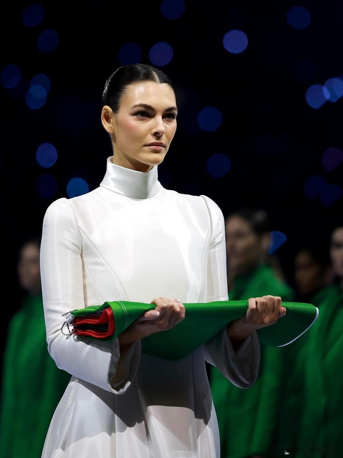 今天的冬奥会开幕式上,意大利当红超模Vittoria Ceretti 身着Giorgio Armani 特别定制白裙,手捧国旗入场,造型简洁典雅,一张黄金比例的意式浓颜脸让人过目难忘!冬奥会开幕式
