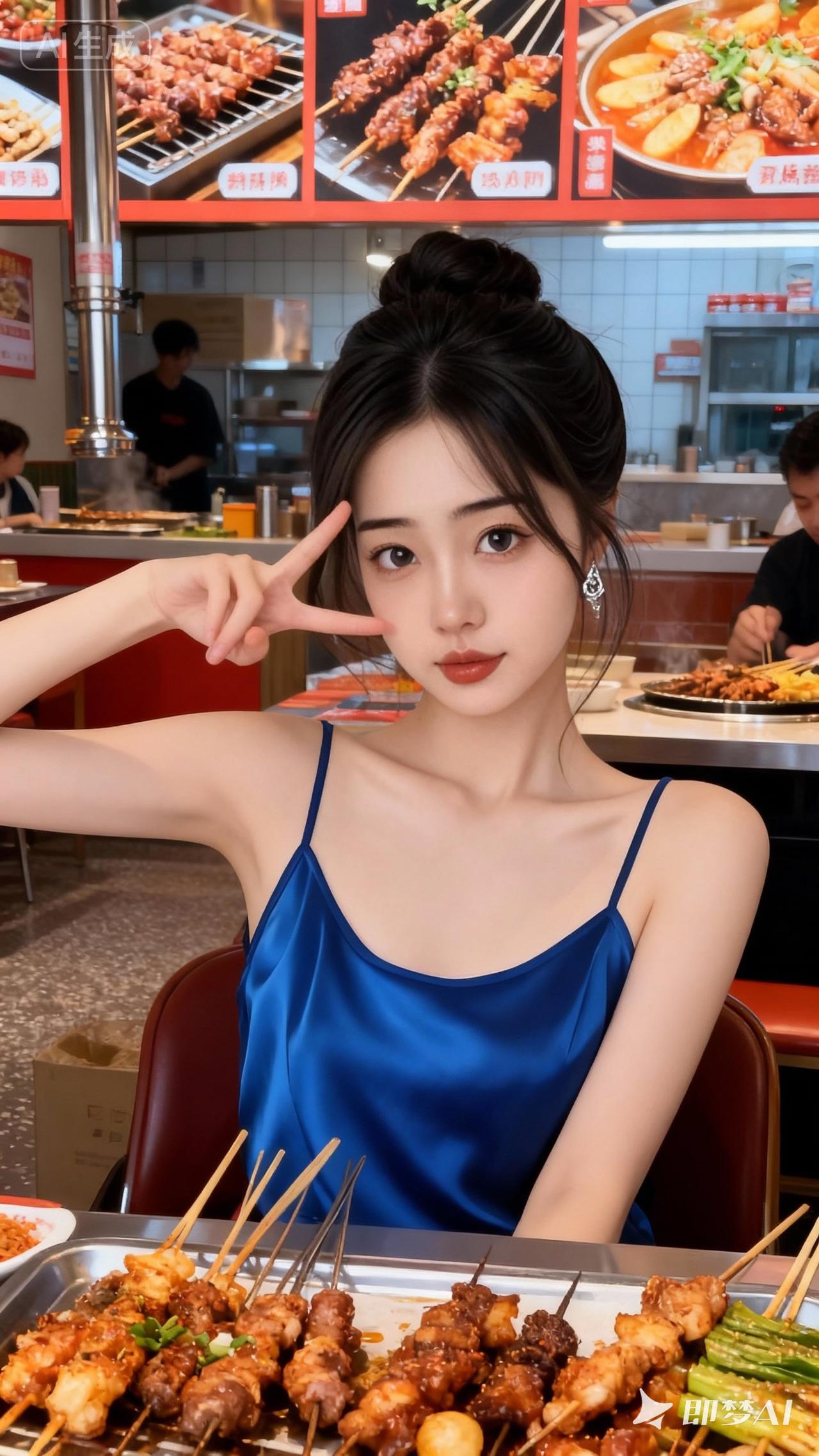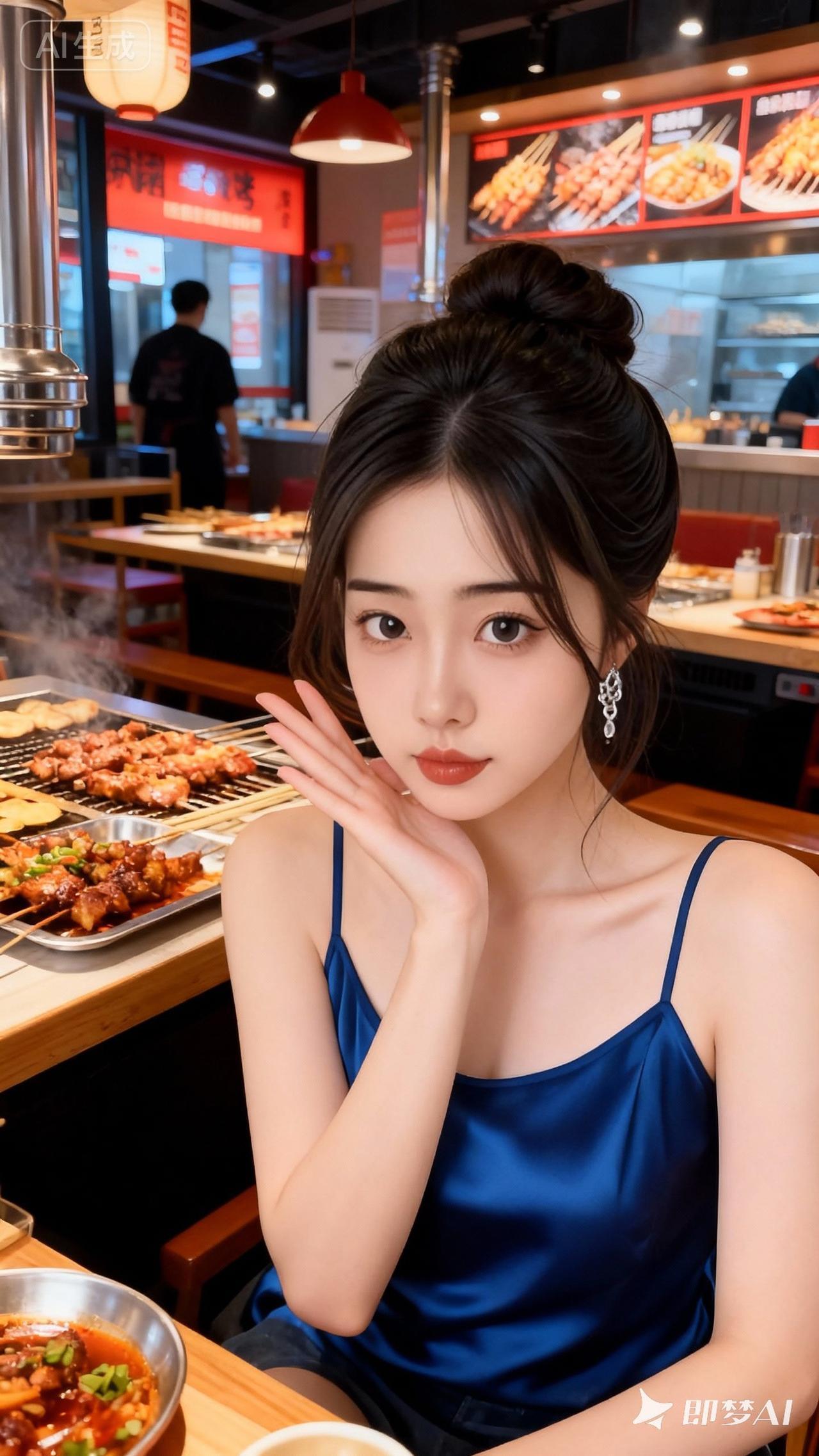穿着时尚的中国年轻高个子女坐在烧烤店里