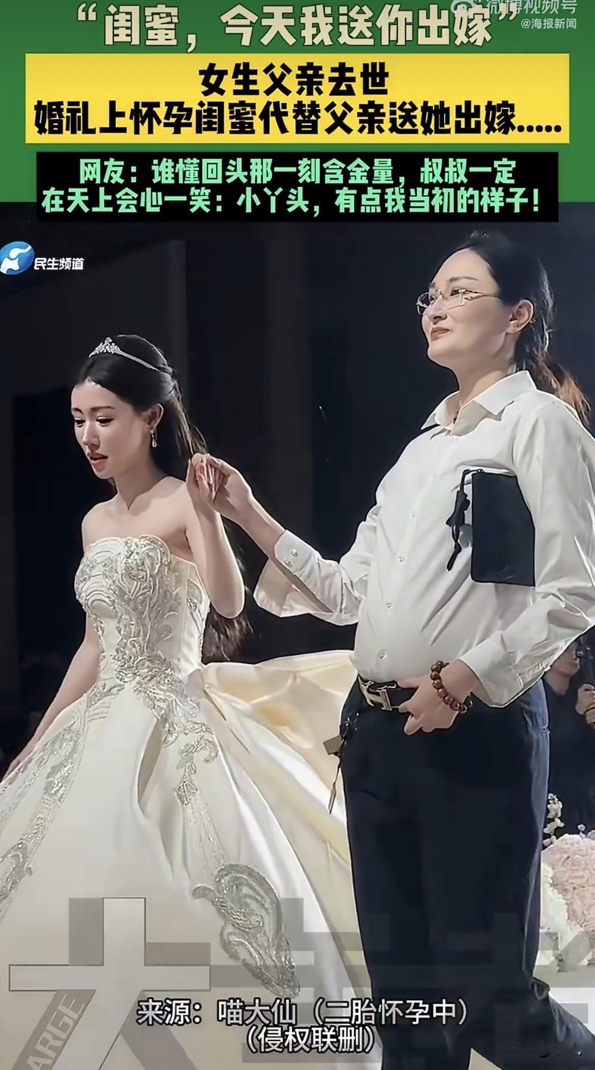 破防了!湖南一场婚礼上,新娘的父亲不在了,谁都没想到,最后是挺着大肚子的闺蜜送她出的嫁。 这闺蜜是悄悄准备惊喜的。她穿一件白衬衫,扎进西裤里,特意在衬衫下摆塞出圆鼓鼓的“将军肚”。手腕上套着佛珠手串,手里还拎个公文包,远远一看,那架势和神态,活脱脱就是个家里长辈的模样。她就这么自然地从人群中走出来,站到新娘身边,挽住了她的手。 那一刻根本不需要解释。新娘一下子就懂了,这个从小一起长大的姐妹,正在用最笨拙又最真诚的方式,填补她生命里那个最重要的空缺。闺蜜挽着她,走得很慢很稳,就像真的父亲那样,郑重地把她的手交到新郎手里。 做完这件事,闺蜜转身退场。脸上还笑着,眼泪却直接掉了下来。她回头看了一眼,那一眼里内容太多:有替姐妹高兴,有对已逝叔叔的怀念,也有完成一件大事后的如释重负。现场很多人都看懂了,偷偷抹眼泪。 视频传到网上,好多人说被这种情谊打动了。但与此同时,另一个话题也被带了出来:好多地方都有老讲究,说新娘当天不能见孕妇,怕“占怀”,影响新娘以后的生育。 这事儿到底有没有道理?我特意去查了。 从医学角度看,这种说法没有依据。东南大学附属中大医院的医生明确说了,孕妇和新娘子接触,不会产生什么生理或病理上的不良影响。怀孕和结婚都是喜事,所谓“喜冲喜”不吉利、会导致新娘几年怀不上之类的说法,属于民间迷信,缺乏科学证据支持。 那为什么会有这种老话传下来呢?有人分析,可能古时候是出于一种现实的关心。婚礼现场人多嘈杂,拥挤热闹。孕妇本身需要安静环境和小心防护,去这种场合确实有安全风险,怕被撞到、摔倒。同样,让孕妇远离新娘,也可能是为了避免孕妇万一在婚礼现场有什么不适,会冲淡喜庆的气氛。久而久之,这份关心就演变成了一种带有禁忌色彩的说法。 所以,回到湖南这场婚礼。那位怀孕的闺蜜,心里肯定只装着对姐妹的心疼和祝福。她用自己怀孕的身体,巧妙地扮演了“父亲”的角色,给了新娘一份无人能替代的支撑。这份情谊,远比任何没有根据的忌讳要珍贵得多。 真正的朋友,就是在你人生最重要的时刻,明明知道自己可能被一些闲言闲语讨论,却还是毫不犹豫地站到你身边,用她的方式,为你撑起一片天。 你对“孕妇不能见新娘”这个老讲究怎么看?你们家乡有类似的说法吗?你觉得是情谊重要,还是遵循老规矩重要?