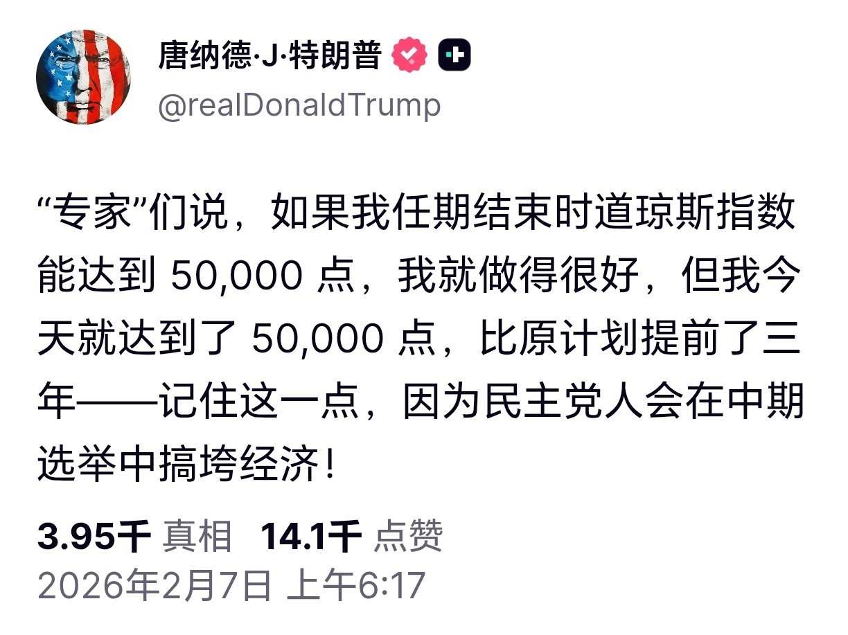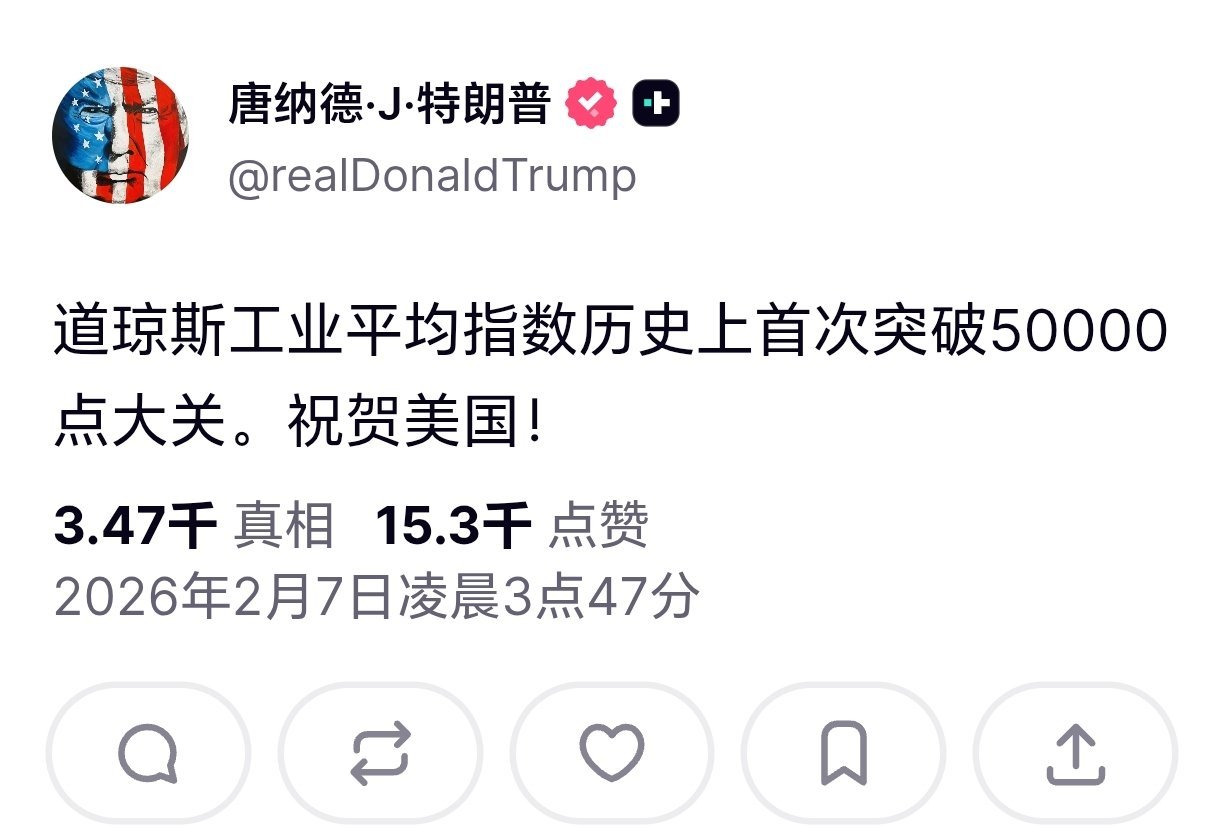 道指首次突破50000点特朗普炫耀道指突破50000点 特朗普发文:道琼斯工业平均指数历史上首次突破50000点。祝贺美国!