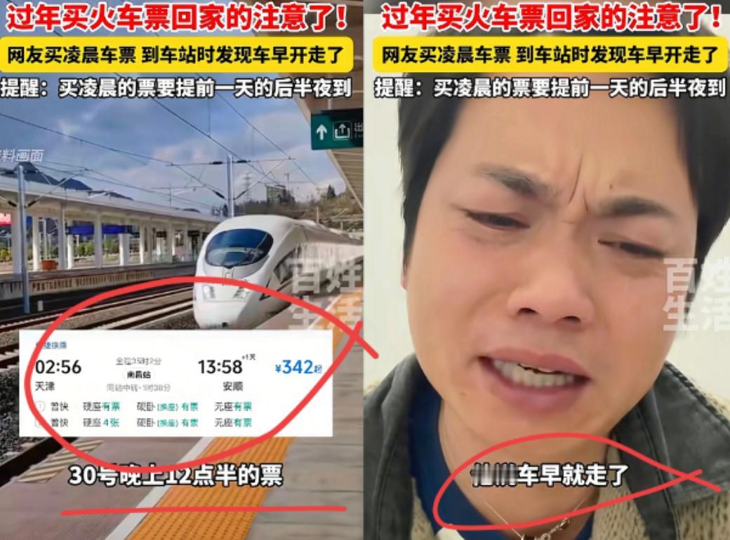 冤不冤?浙江杭州一男子买了30日凌晨十二点多的火车票,他当天晚上十一点去候车,等了半天却发现没人检票,一问才知道,车早开走了。 大哥之前在网上买了张火车票,目的地没多说,重点是发车时间,写的是30日凌晨十二点多,也就是咱们常说的00点出头。 大哥一看这个时间,没多想,心里琢磨着,30日凌晨十二点多,那不就是30号晚上十二点多嘛,反正都是半夜,晚点去候车也不迟。 等到30号当天,大哥忙完手里的活儿,吃了晚饭,又歇了一会儿,眼看快到晚上十一点了,才慢悠悠地收拾好行李,拎着包往火车站赶。 他心里还挺有底,觉得自己提前一个多小时到,肯定绰绰有余,既能歇会儿,也不会错过检票。 可等到了火车站,找到对应的候车区域,大哥找了个位置坐下,盯着检票口的屏幕看了半天,眼看着快到十二点了,周围的人越来越少,检票口那边却始终安安静静的,连个工作人员检票的影子都没有。 一开始大哥还没太着急,以为是火车晚点了,或者检票时间推迟了,就一直耐着性子等。 就这么又等了半个多小时,还是没人检票,旁边也没剩下几个候车的人了,大哥这才慌了神,赶紧拎着行李跑去找工作人员问情况。 结果工作人员一查他的车票,随口说了一句,你这趟车早就开走了,都快开走一整天了。 大哥当时就懵了,站在那儿半天没反应过来,反复跟工作人员确认,我买的是30号凌晨的票啊,我晚上十一点就来了,怎么会开走了? 直到工作人员跟他解释清楚,大哥才恍然大悟,说白了,问题就出在这个“凌晨十二点多”上。 咱们平时看时间都是24小时制,过了29号晚上23点59分,再走一分钟,就到30号凌晨00点了。 等于说30日凌晨十二点多的火车,其实是在29号晚上过完十二点之后发车,检票也得在29号深夜就开始。 大哥把30日凌晨十二点多,理解成了30号晚上十二点多,相当于晚到了整整一天。 他30号晚上十一点去候车的时候,其实已经是31号的凌晨了,火车早在29号深夜到30号凌晨之间就已经发车了,他自然是赶不上的。 大哥听完解释,脸都垮了,又无奈又委屈,说自己也没注意这么细,谁能想到凌晨十二点多,还分前一天晚上和后一天晚上啊,他白等了半天不说,还错过了行程,只能重新买票或者改签,又费时间又费钱。 其实这事真不能全怪大哥,很多人都会犯这样的错,尤其是凌晨前后的时间,处在两天的交界,很容易让人混淆,总觉得“凌晨十二点多”和“晚上十二点多”是一回事,殊不知差这一字,就差了整整一天。 后来大哥也说,自己这次算是买了个教训,以后再买火车票,不管是凌晨还是深夜的,肯定要多看几遍发车时间,看清楚是哪一天的凌晨,再也不犯这种低级错误了。 也借着大哥的经历,提醒一下大家,平时买凌晨前后的火车票,一定要多留个心眼,看清楚票面的具体时间,别像这位大哥一样,把30日凌晨当成30号晚上,白白耽误行程,得不偿失。