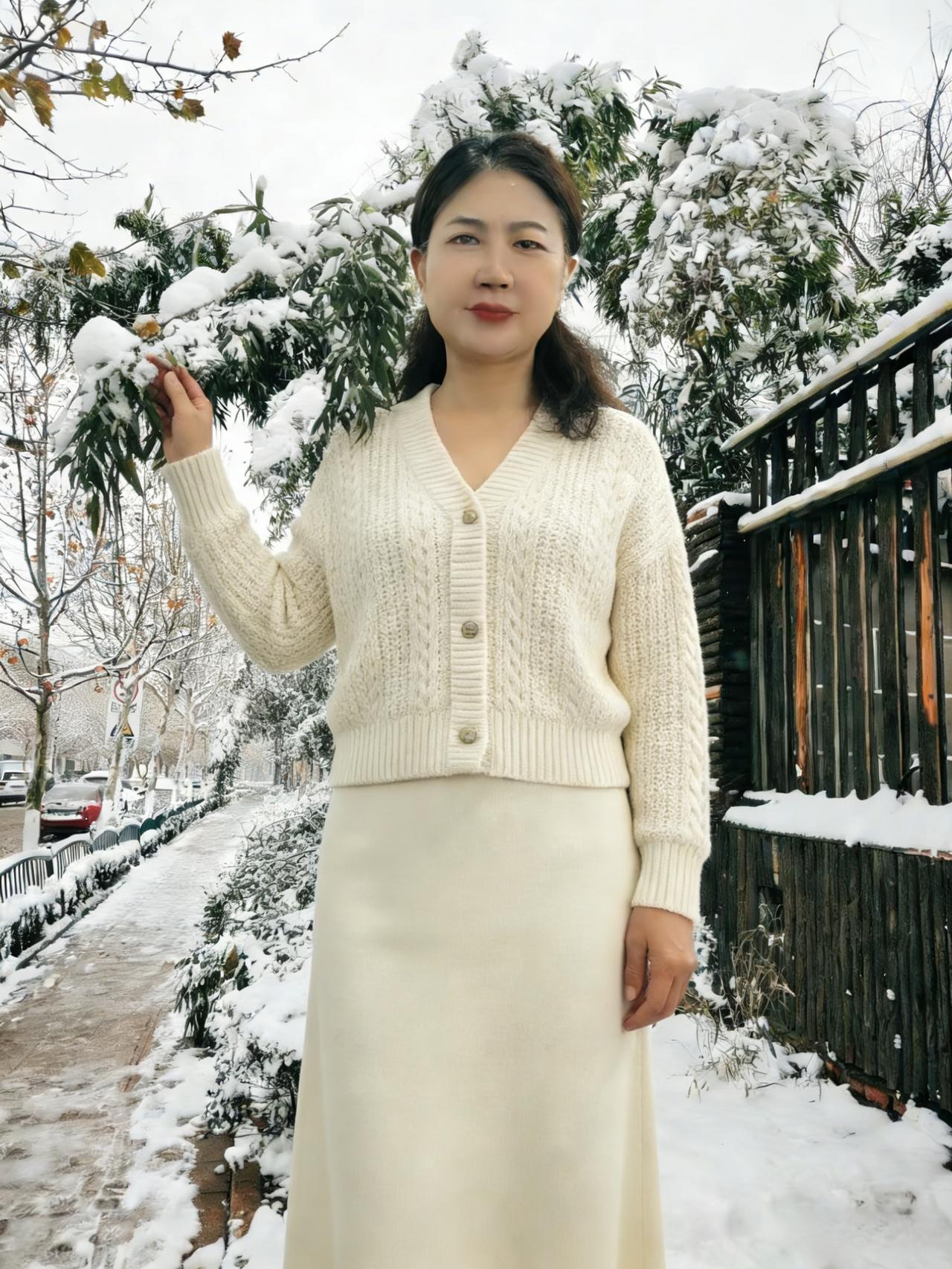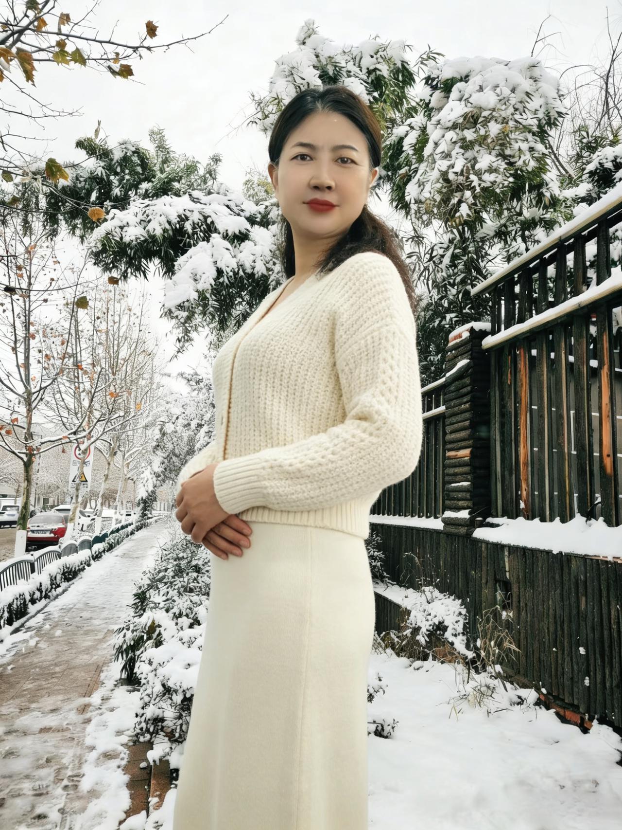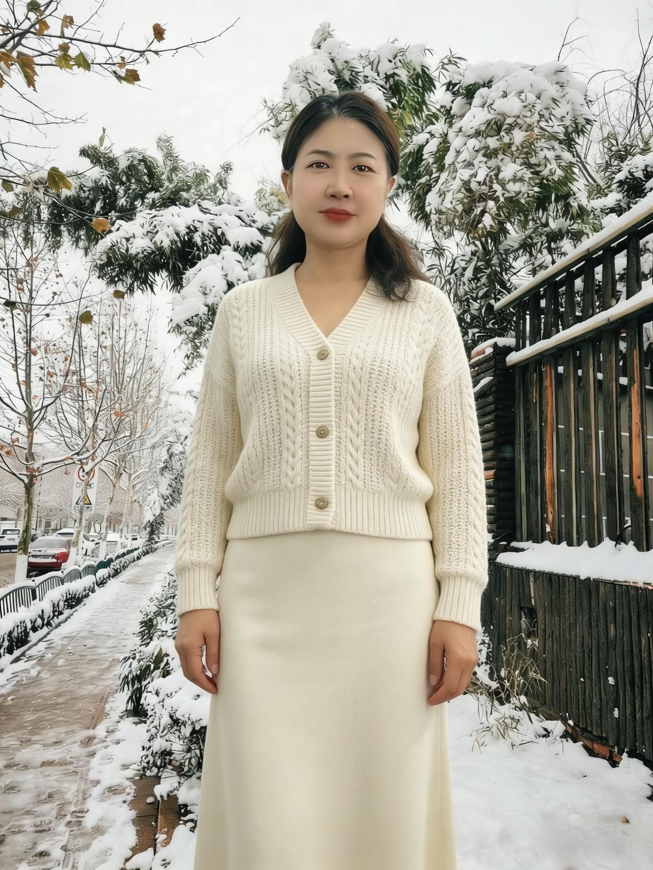 《雪径素影》 踩着融雪的石板路 鞋底沾着细碎的冰碴 她的白针织衫 把寒风隔在半尺之外 ~ 长发松松挽着,几缕碎发 被雪风吹得贴在颊边 像时光的手指,轻轻拂过 ~ 木栅栏后,雪压着翠竹 枝桠弯出好看的弧度 她的脚步很慢 像怕踩碎了这冬日的宁静 ~ 针织开衫的纽扣扣得整齐 像把温柔的心事,一一收好 白裙垂落,与雪地的白 融成一片柔软的光 ~ 不必奔赴远方,不必寻找热闹 在这雪后的小径上 她与自己的影子同行 接住了时光递来的静好