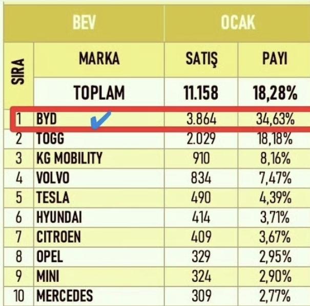 1月土耳其市场,比亚迪首次拿下纯电车销冠 1 :比亚迪3864 辆 2: TOGG(土耳其本土品牌) 2029辆 3: KG Mobility 910辆 4: 沃尔沃834辆 5: 特斯拉490辆 1月比亚迪纯电销量3864辆,纯电车领域市占率34.63%,这也是比亚迪首次超过本土品牌TOGG,销量更是特斯拉的7倍多。不得不说在纯电领域,比亚迪在土耳其备受欢迎。