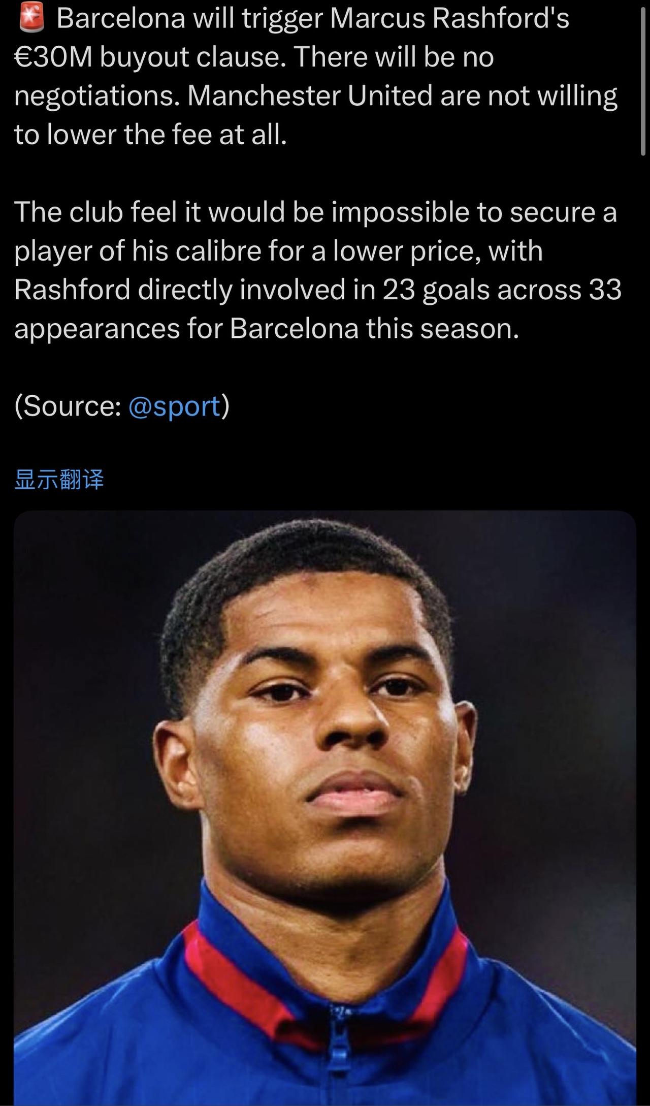 曼联这个决定非常正确! 有些毛病不能惯着,太多球队被薅羊毛了! ……………………………………………………………… 巴萨需要激活马库斯·拉什福德的3000万欧元买断条款。双方不会进行任何谈判。曼联方面完全不愿意降低转会费。 巴萨应该意识到不可能以更低的价格签下像拉什福德这样级别的球员,本赛季拉什福德代表巴塞罗那出场33次,直接参与了23个进球。