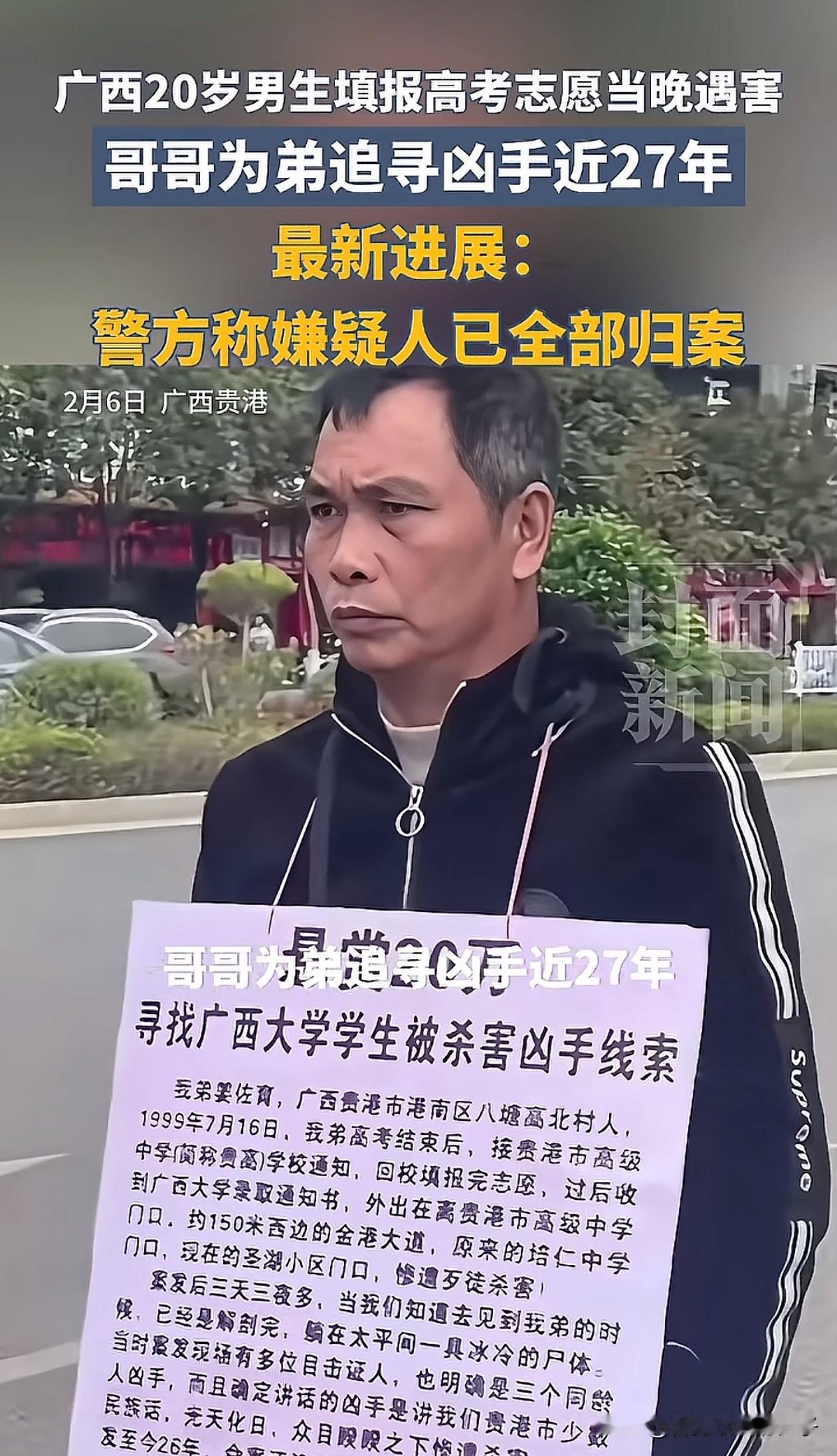 广西贵港,大学生姜佐育被害案终于告破了,潜逃27年的3名嫌疑人全部被抓! 1999年,20岁的姜佐育填报完志愿在回家的路上,被3名陌生青年杀害,姜佐育哥哥为了能早日找到杀害弟弟的人,毅然决定辞职,每日和父亲奔走在贵港的街头,举着牌子四处寻找线索。 在寻找凶手的过程中,哥哥姜佐棉直播时还被威胁:如果在街上看见他,要让他段手脚,坐着 轮 椅 直播,但这并没有阻止哥哥为弟弟寻凶的决心! 找了27年,如今终于传来好消息,据相关媒体2月6日最新报道,3名嫌疑人已经全部抓住。 真的太可惜了,姜佐育如果没有遇害,肯定有大好的未来,如今案件告破,希望能给父亲和哥哥一个安慰,终于能睡个安稳觉了!