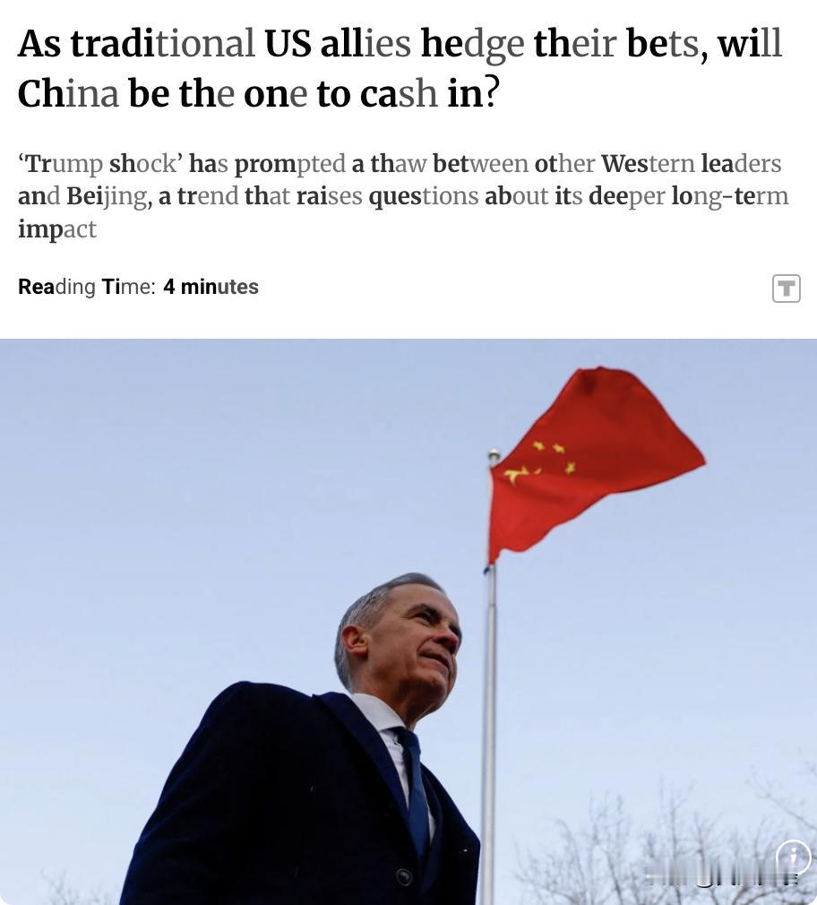 外媒:美国传统盟友对冲押注,中国能否从中获利? 特朗普重新执政引发的"特朗普冲击"促使西方领导人与中国关系解冻,这一趋势引发了对其深层长期影响的疑问。 加拿大总理马克·卡尼1月在达沃斯警告美国主导的全球秩序出现"裂痕",敦促"中等强国"团结应对"大国竞争新时代"。卡尼是今年涌入中国的多位西方领导人之一。 上周英国首相基尔·斯塔默访华,结束了长达8年的外交冻结期,标志着传统美国盟友在特朗普行为对长期关系施加压力之际主动接触北京的努力达到高潮。1月除了卡尼,爱尔兰、芬兰和韩国领导人也访问了中国,德国总理弗里德里希·默茨正在考虑访华计划。 观察人士认为,这可能标志着中国正从惯常外交方式转向"楔子战略"——利用美国盟友试图对冲风险、在华盛顿和北京之间保持多门开放的趋势,重塑全球力量格局。