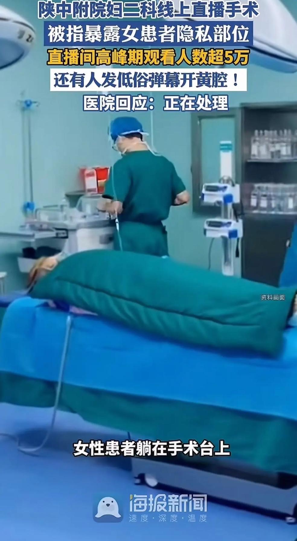 “现在的医生真是无法无天了。做手术敢直播,还敢不遮盖人家的隐私部位!”多名网友在社交平台曝光,陕西中医药大学附属医院妇二科在网络平台直播做手术,画面中直接出现女性患者隐私部位,多名网友举报后,直播中断。 手术直播暴露隐私,医疗底线何在? 做手术敢直播,还敢不遮盖人家的隐私部位!”近日,多名网友在社交平台愤怒曝光,陕西中医药大学附属医院妇二科在网络平台直播手术时,画面中竟直接出现女性患者隐私部位,此事件如一颗重磅炸弹,瞬间在网络上掀起轩然大波。 据网友爆料,2月2日晚,在该医院妇二科的直播画面里,一名女性患者躺在手术台上,下身隐私部位毫无遮掩地暴露在外,这一画面让众多网友惊愕不已。原本以为只是普通的医疗直播,没想到会看到如此不堪的一幕。直播间热度迅速攀升,高峰期观看人数一度达到5万多人。更令人气愤的是,直播间里竟有人弹幕开黄腔,发表低俗评论,而这样不尊重患者的直播在被多次举报后才中断。 事件发生后,陕西中医药大学附属医院迅速展开调查并发布情况通报。原来,2月2日18时,妇二科在其科室微信视频号进行直播教学,教学内容为压力性尿失禁手术治疗及并发症处理,教学期间间断播放了约4分钟的“经尿道中段无张力悬吊术”教学视频,该视频中出现了女性患者局部隐私部位,不过无可识别个人身份信息,且授课人员发现网友异常评论后立即中断了直播。 医院表示,这是将内部教学视频错误使用了公众平台进行网络直播学习,反映出医护人员网络素养的缺失和短板,也暴露出医院对科室学习管理工作存在漏洞和过失。目前,医院已关闭相关直播链接,在全院深入开展教学内容及平台渠道排查,并对妇二科负责人给予严重警告处分并停职检查,对负责审核的医务部有关责任人给予警告处分,相关院领导已报上级党委进一步处理。 医疗直播本是为了促进医学交流、普及医疗知识,但绝不能以牺牲患者隐私为代价。此次事件为所有医疗机构敲响了警钟,在追求医疗创新与传播的同时,必须坚守法律和道德底线,尊重和保护患者的合法权益。手术直播 不遮盖病人的隐私部位