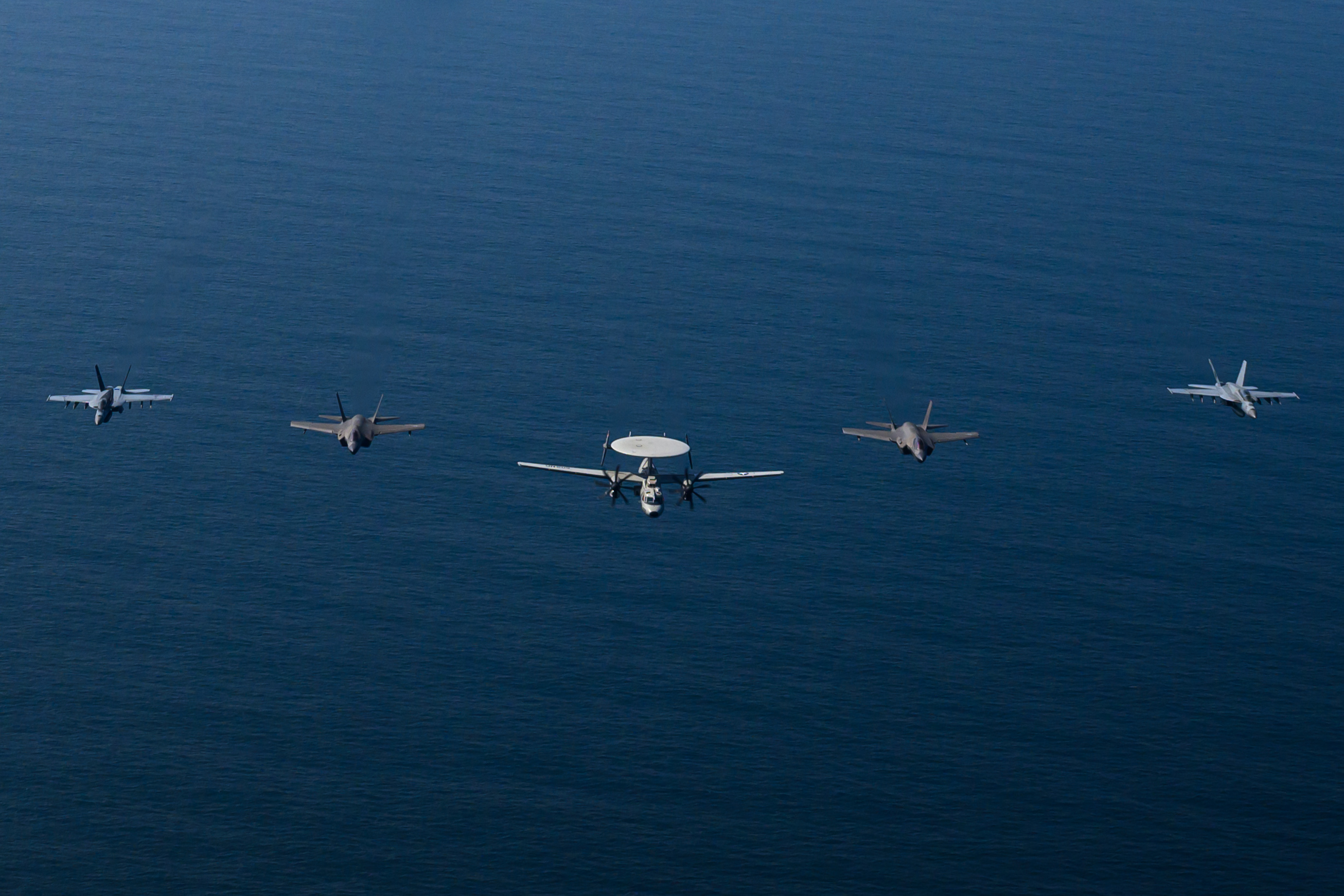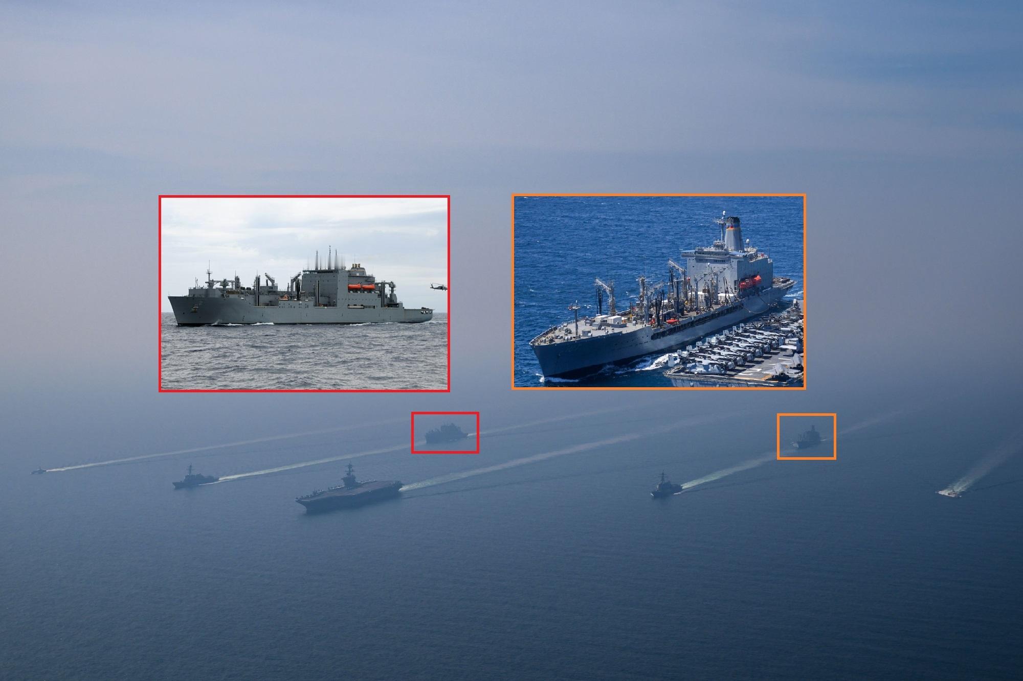 美军中央司令部放出的在阿拉伯海某处游弋的林肯号航母战斗群,除航母外,还有2艘伯克级驱逐舰和2艘美国海岸警卫队的巡逻船护卫,1艘4.5万吨级的“刘易斯和克拉克级”干货弹药补给舰和1艘3.1万吨级的“亨利·J·凯泽级”油料补给舰提供保障。