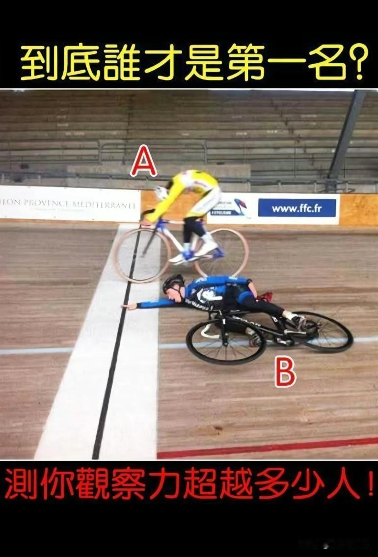 到底谁才是第一名? 关键起点是以车还是以人为标准!那么终点也一样。赛车还是赛人?赛车车先到为赢,赛人人先到为赢,这个道理都不懂还做裁判?真可笑。还有一种情况,如果b他的车子撞线了,可是他人没在车上,从车子上掉下来了,他仍然不能算第一,自行车比赛,是车子和人结合在一起