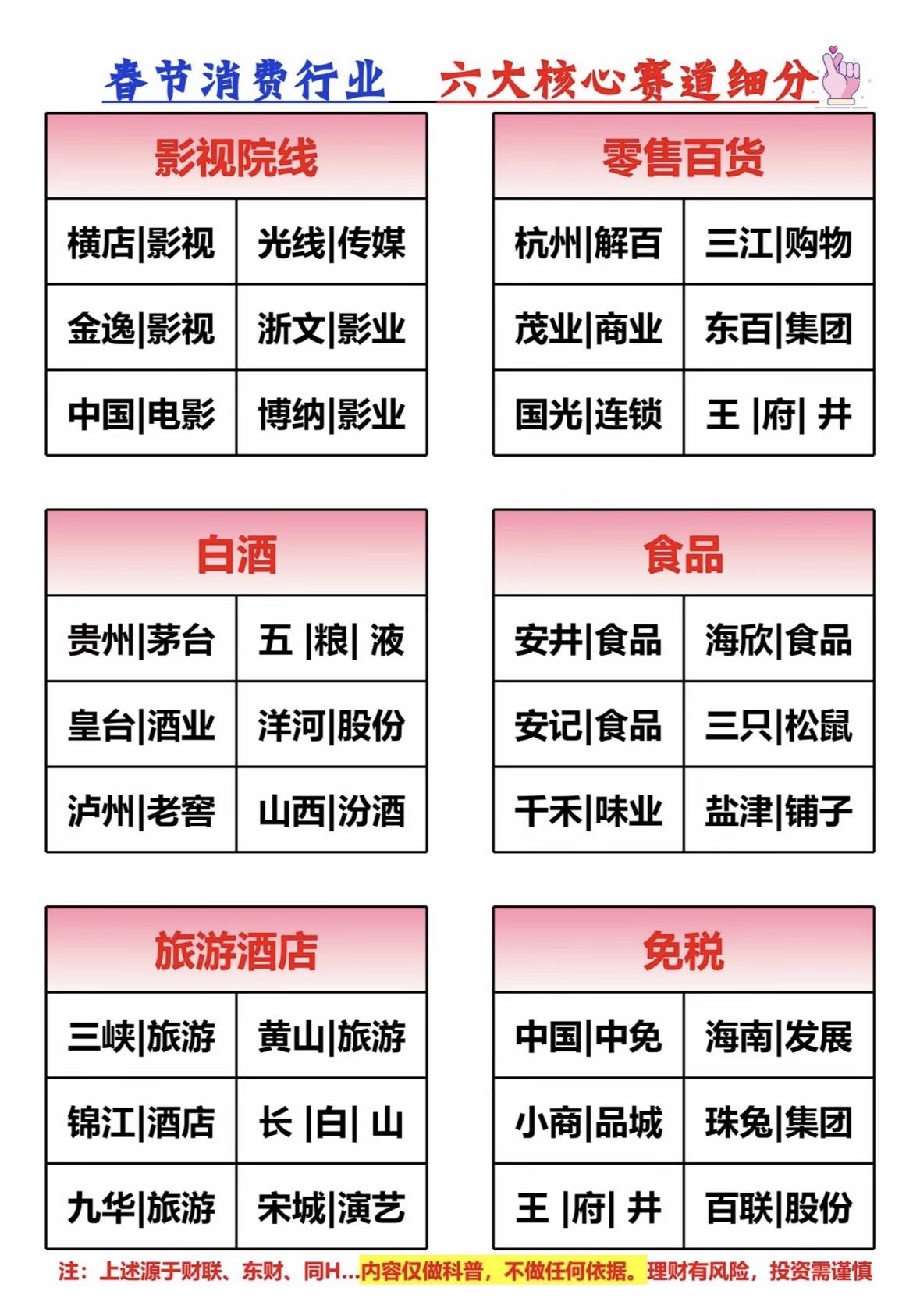 春节消费行业六大核心赛道细分指南 春节消费聚焦六大赛道:影视院线、零售百货、白酒、食品、旅游酒店及免税,涵盖横店影视、茅台、中免等龙头,投资需理性。