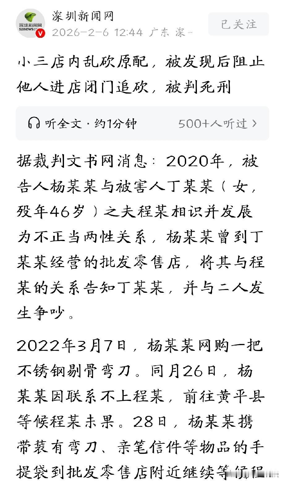 都是渣男惹的祸!贵州,女子明知男子有家室,还跟对方发展成不正当关系,甚至恬不知耻跑到原配的店里坦白了两人的关系,想要逼迫原配让位。得知同床共枕多年的丈夫竟干出这种事情,原配和丈夫大闹一场,男子意识到自己错了,打算和女子撇清关系,回归家庭。女子感觉自己被抛弃了,一气之下买了把刀,跑到原配店里追砍对方,导致原配不幸身亡。最终,她的恶行得到了法律的制裁。 2020年,女子杨某认识了有家室的程某,两人偷偷发展成了不正当关系。 杨某不仅不觉得羞耻,甚至还想逼程某的妻子丁某让步,她好名正言顺的跟程某一起生活。 丁某开了一家批发零售店,为了达到目的,她直接跑到丁某的店里,当着丁某和程某的面,大言不惭的诉说自己和程某的关系。 一听这话,丁某当场气炸,她没想到,同床共枕多年的丈夫竟然能背着自己干出这种事,还被人找上门来。 看着丁某愤怒又绝望的样子,杨某心里居然还有点得意,觉得自己占了上风。 之后的两年里,杨某和程某的关系起起伏伏。 2022年3月,她开始频繁联系程某,可程某却躲着她不回应,杨某心里的怨气越来越重,觉得程某潇洒够了,是想抛弃自己。 这口气她自然咽不下,3月7号,她网购了一把不锈钢剔骨弯刀,好像在为某些事情做准备。 3月26日,杨某一路赶到程某住处等他,可一连耗了两天,连程某的人影都没见着。 杨某心里的愤怒彻底发作,她觉得自己被耍了,越想越不甘心。 28号,她带着装着弯刀、亲笔信件的手提袋,来到丁某的批发零售店附近,继续蹲守,她发誓,定要让程某和丁某付出代价。 一直等到晚上23点40分,程某还是没来。杨某彻底失去了耐心,她戴上遮面凉帽,套上围裙,伪装成顾客走进了丁某的店里。 一开始,丁某没认出她,还热情地问她要买什么,可当杨某开口问程某在哪的时候,丁某这才听出了她的声音,脸色瞬间变了,厉声质问她,为什么还来纠缠。 两人随即爆发了激烈的争吵,互相推搡抓扯起来。 杨某被丁某骂急了,猛地抽出藏在包里的弯刀,朝着丁某某胡乱砍去。 丁某大声呼救,附近的群众听到喊声赶过来,马上报警。 杨某看到围观的人越发多了,冲过去一把拉下门店卷帘门,将自己和丁某锁在了店里。 失去了外界的干扰,杨某变得更加凶残,她像疯了一样在店里追砍丁某,丁某无处躲藏,不幸身亡。 经法医鉴定,丁某是全身多处损伤加颈内静脉破裂大出血死亡。 法庭上,杨某狡辩,说自己是一时冲动。但从她买刀、蹲守到杀人,整个过程明显都是有预谋的。 《刑法》第232条规定:故意杀人的,处死刑、无期徒刑或者十年以上有期徒刑;情节较轻的,处三年以上十年以下有期徒刑。 杨某因感情纠纷蓄意报复,提前网购刀具、蹲守预谋,主观上具有非法剥夺他人生命的直接故意。 客观上,她持弯刀追砍丁某并关闭店门阻止救援,最终致其死亡,行为与死亡结果存在直接因果关系,已构成故意杀人罪。 杨某手段残忍、后果严重、主观恶性极大,不属于“情节较轻”情形。 结合其预谋杀人、暴力行凶、拒不悔罪等情节,最终,省高院做出刑事裁定,以故意杀人罪判处杨某死刑,剥夺政治权利终身。 这场悲剧,说到底还是渣男一手造成的,毁了两个女人的一生,原配无辜丧命,第三者也落得死刑下场,只剩他全身而退。 时间一久,他大概率淡忘一切,再婚过日子,可两条人命再也回不来,这种始乱终弃的人,才是最该被谴责的。