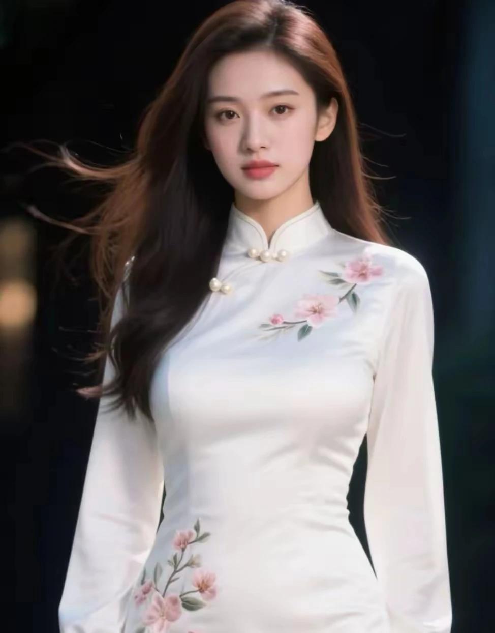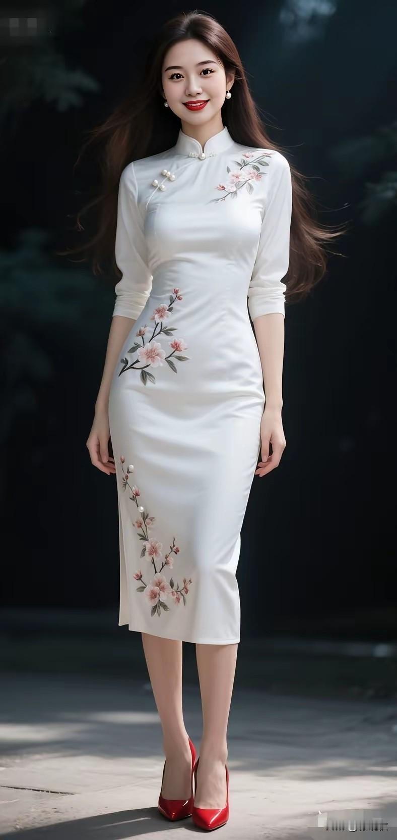 旗袍雅致韵味声, 白底素花显风情。 青丝如瀑随风舞, 容颜绝世韵倾城。