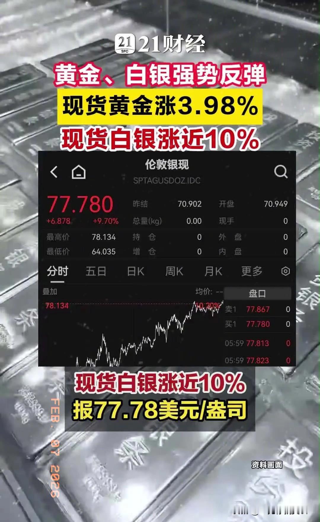 美东时间2月6日, 贵金属市场迎来强势反弹! 美东时间2月6日,现货黄金直接涨了3.98%,报价4966美元/盎司,白银更猛,涨幅逼近10%,报77.78美元/盎司。 此前金银经历了一波大跌,这次反弹来得很及时,想来是市场情绪回暖,加上避险需求和降息预期的加持,不少投资者都盯着这波行情呢,后续走势值得持续关注。