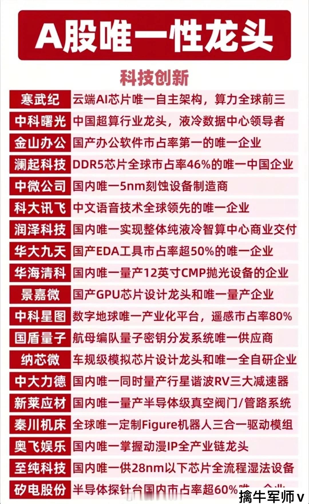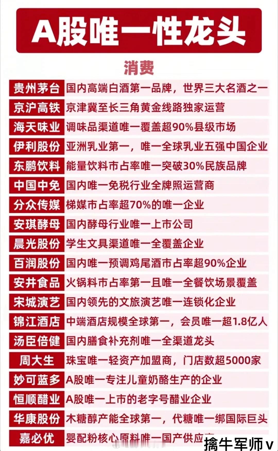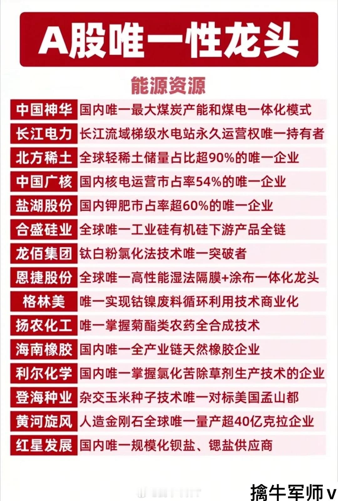 A股唯一性龙头全梳理!核心标的值得硬核收藏!这份名单涵盖能源资源、固态电池、工程机械、文娱、消费、生物医药、科技创新七大核心赛道,挖掘各领域真正具备“唯一性”的龙头企业。硬核逻辑,一眼看懂核心竞争力,赛道龙头,把握产业发展主脉络。这份名单,是你布局A股的硬核参考,建议收藏反复研究!