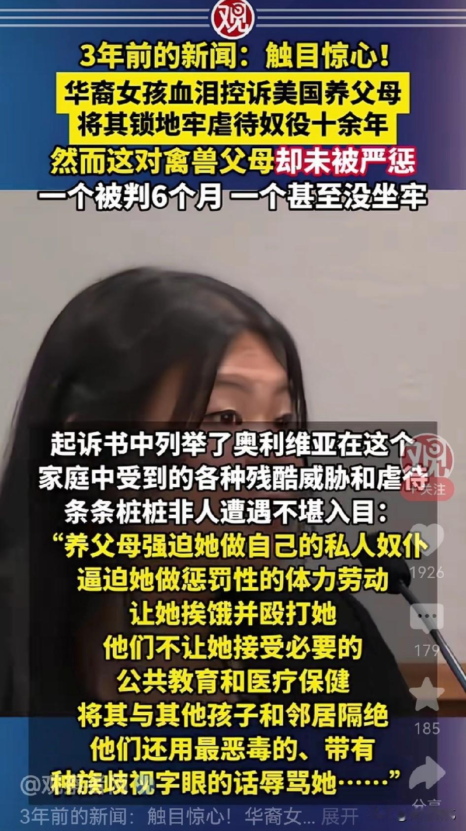 这个小女孩是不幸中的万幸, 虽然她从小就遭受了美国养父母的虐待,十多年间一直把她锁在地牢里,把她当奴隶一样的使唤,但毕竟幸运的活下来了。 从1992年到2024年期间,美国家庭一共收养了8.2万名中国儿童,其中80%以上为女童,而这个被长期虐待的小女孩就是其中之一,她靠着自己顽强的生命力挺了过来,就是不知道和她同样境况的小女孩们,如今过的怎么样?