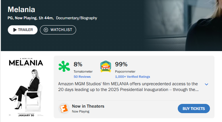 这部纪录片视角聚焦于梅拉尼娅·特朗普在丈夫第二次就职典礼前的 20 天生活。目前该片在烂番茄上呈现出极其罕见的两极分化:专业影评人给出的新鲜度仅为 8%,而观众评分却高达 99%。