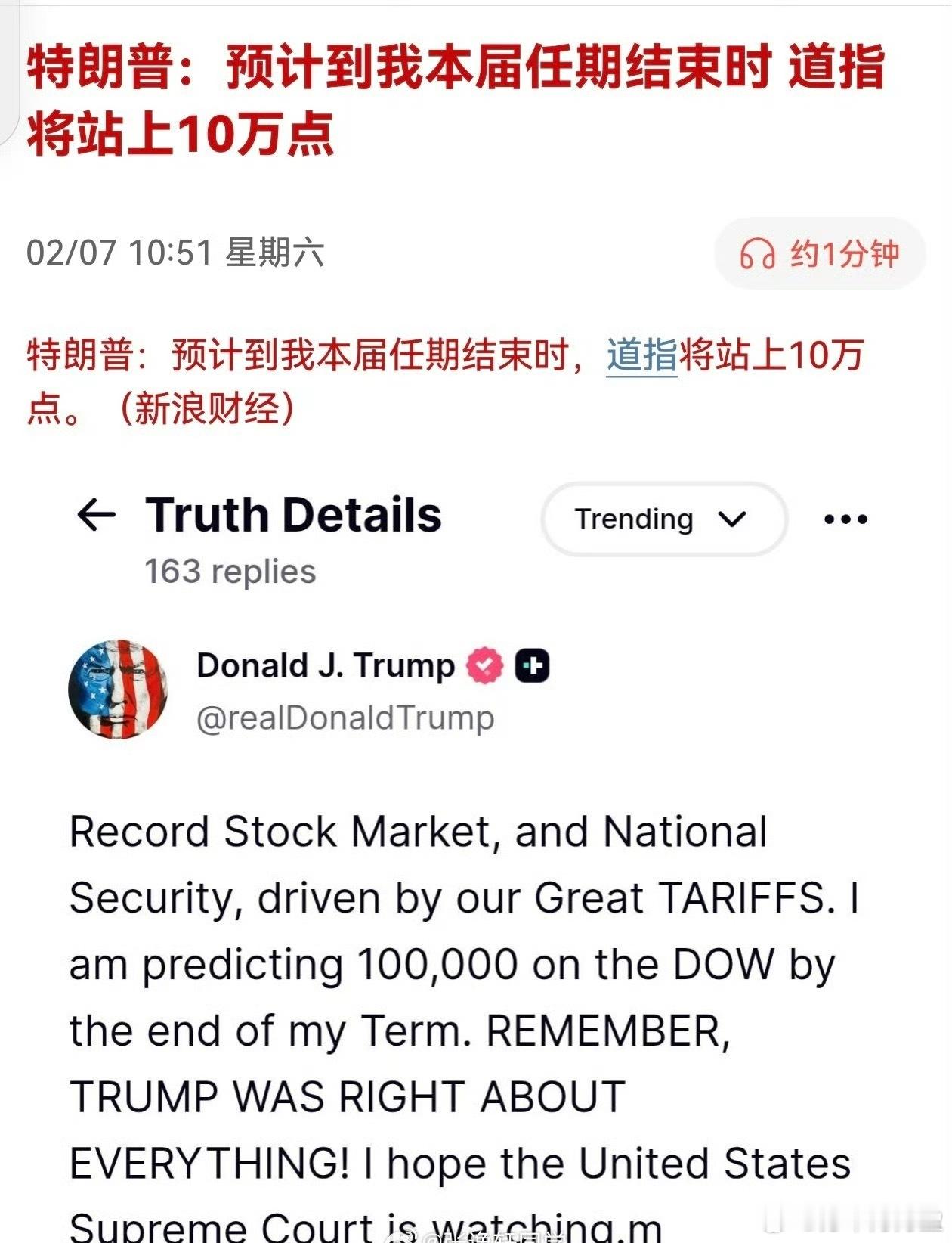 转:【特朗普:创纪录的股市得益于关税政策 道指将涨至10万点】2月7日讯,特朗普:美国股市创纪录,国家安全也得到保障,这都得益于我们伟大的关税政策。我预计在我任期结束前,道指将涨至10万点。记住,特朗普说的一切都是对的!我希望美国最高法院正在关注这些情况。